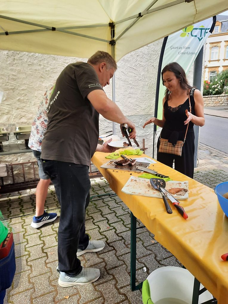 « Riesling Open » ass nees ugesot, déi nei Kinnigin (Sara Rinnen) am Amt a säit dësem Joer mëscht op dësem Fest ee ganz neien Acteur mat : face zum Domaine Max-Lahr huet de « Gaart an Heem Uewerkäerjeng » seng Zelter opgeschloen. Virun dësen leeft e sëllege Gäscht reegelrecht d‘Waasser am Mond zesummen. Feinste Mäifel ginn hei opgedëscht: op Fleesch, Fësch oder vegetaresch, fir all Goût ass eppes dobäi. Am Service, do fluppt et, an dach, ët bleift ëmmer Zäit fir e frëndlecht Wuert. Am Nu sti Spare-Ribs, Reecher-Saumon, Truite saumonée de l‘Our an/oder Porettenzapp inklusive Begleedung um Dësch. Frësch gestäerkt maachen sech vill zefridde Gesiichter op de Wee a ginn sech vun der Qualitéit vun de Lëtzebuerger Cremanten a Wäiner iwwerzeegen.