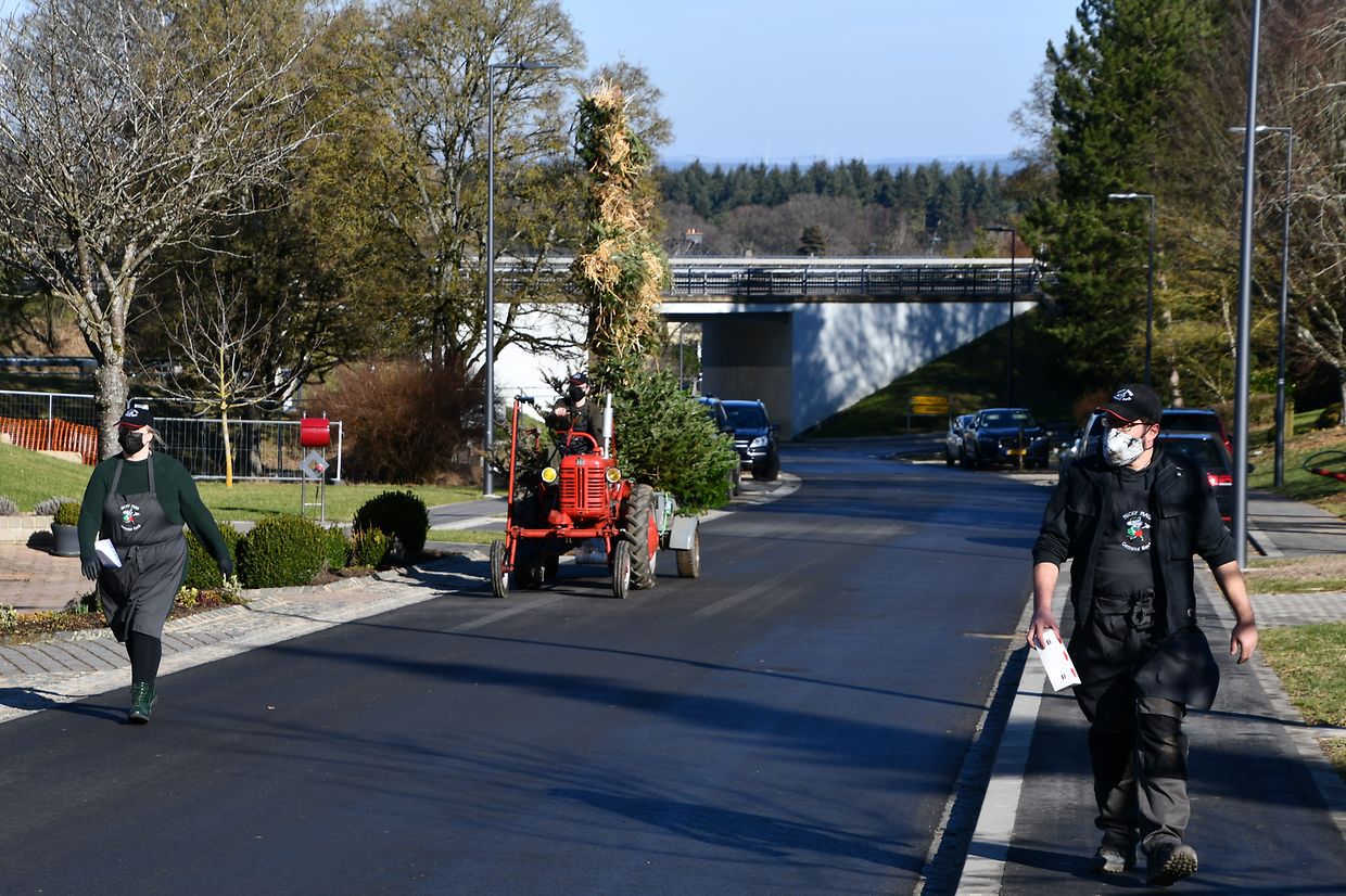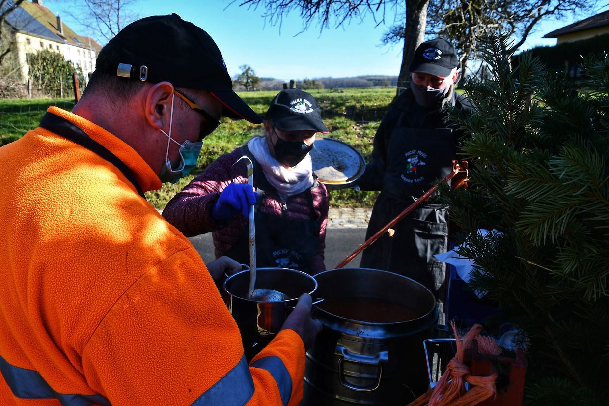 Stattdessen sinn Sonndes Mëttes 2 Equipen -entspriechend equipéiert mat klenger Buerg um Won - duerch déi 4 Uertschaften Altréier, Heeschbreg, Kräizenhéicht a Kuebebuer gefuer an hunn vum Won aus Gulaschzopp vun Dir zu Dir (op Umellung am Virfeld!) servéiert.