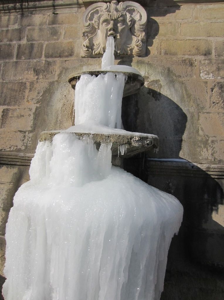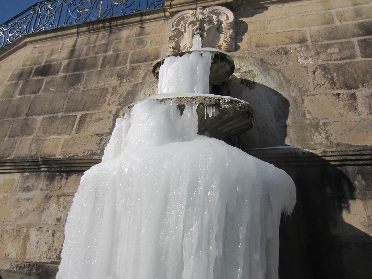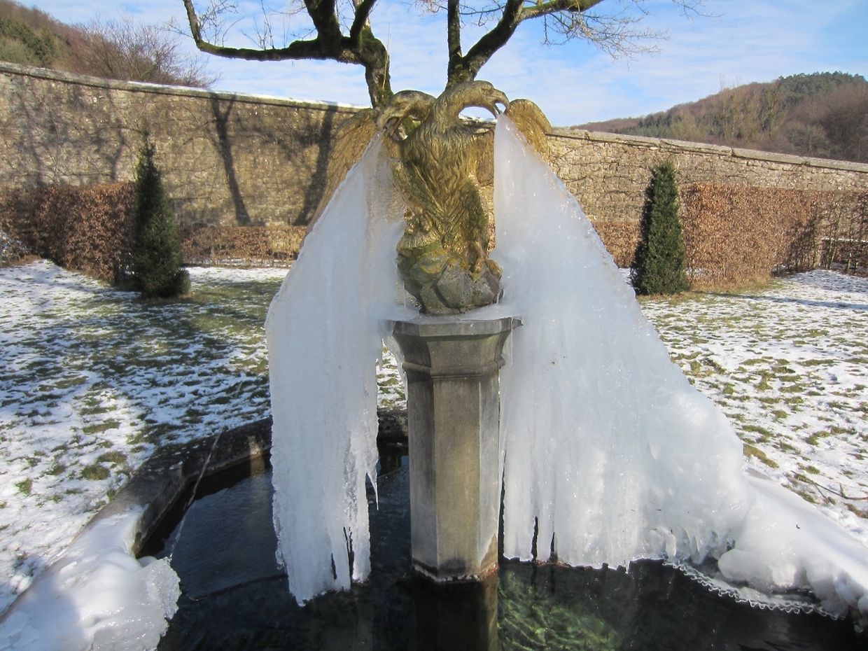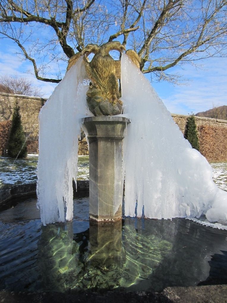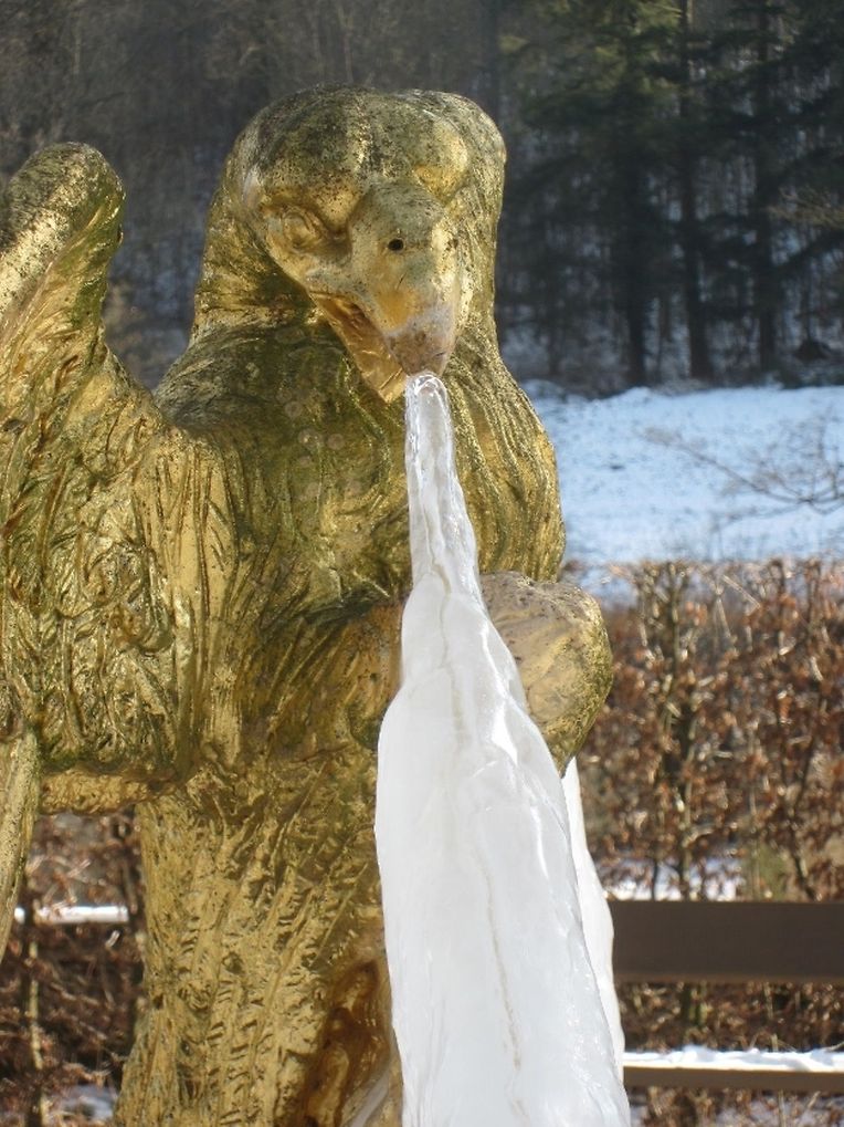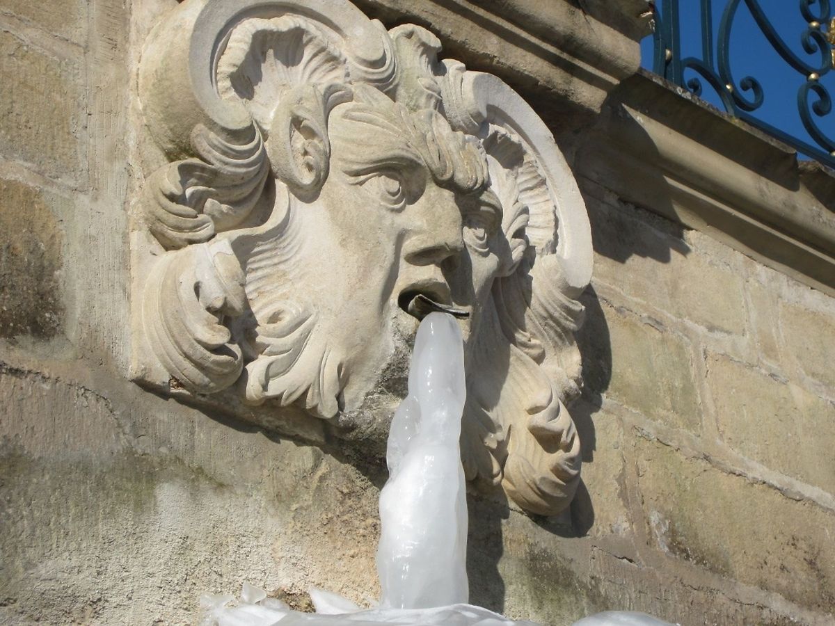 Der wasserspeiende Kopf an der monumentalen Treppenanlage spuckt nur noch gefrorenes Wasser. Eine endlose Zunge aus Eis wächst ihm aus dem Maul - ein doch etwas eigenartiger Anblick in diesen frostigen Tagen im barocken Schlossgarten Ansembourg!