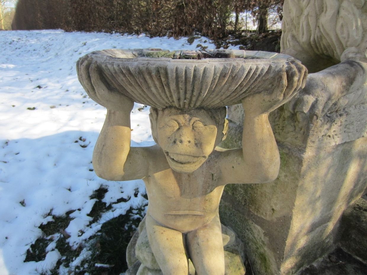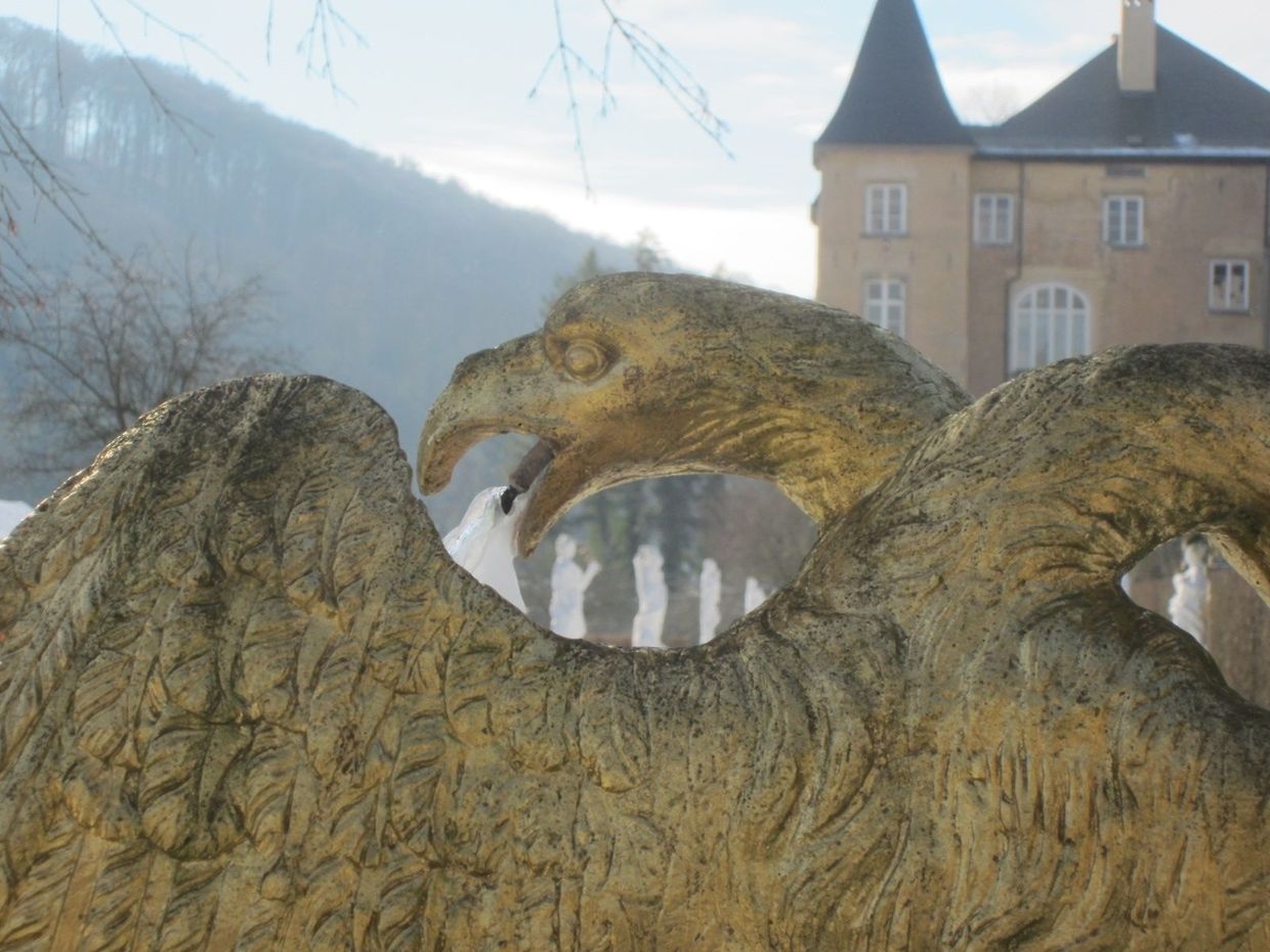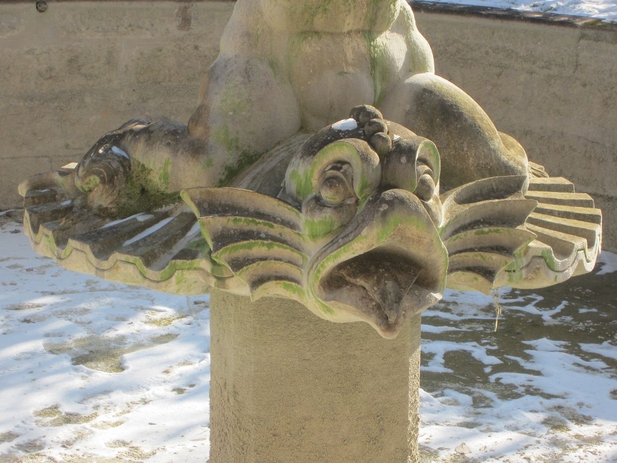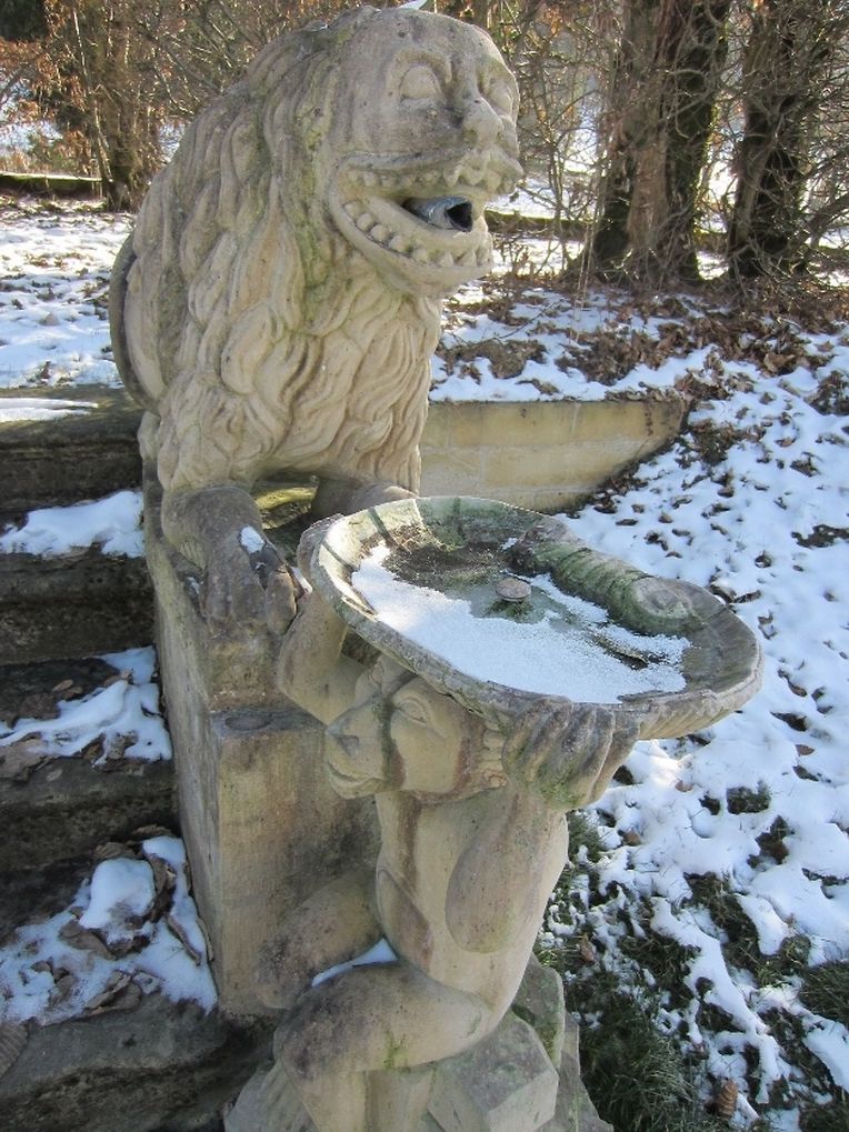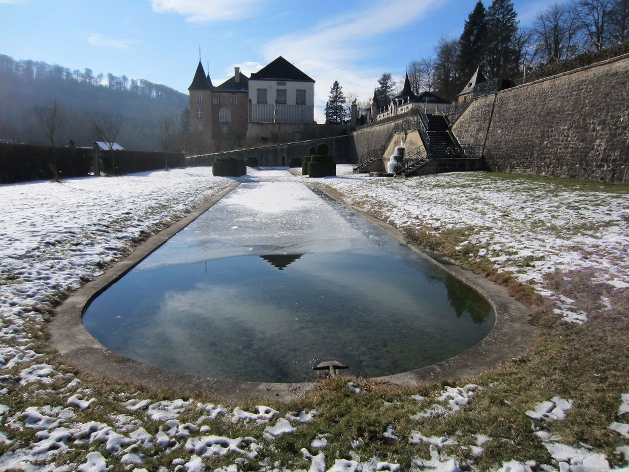 Der wasserspeiende Kopf an der monumentalen Treppenanlage spuckt nur noch gefrorenes Wasser. Eine endlose Zunge aus Eis wächst ihm aus dem Maul - ein doch etwas eigenartiger Anblick in diesen frostigen Tagen im barocken Schlossgarten Ansembourg!