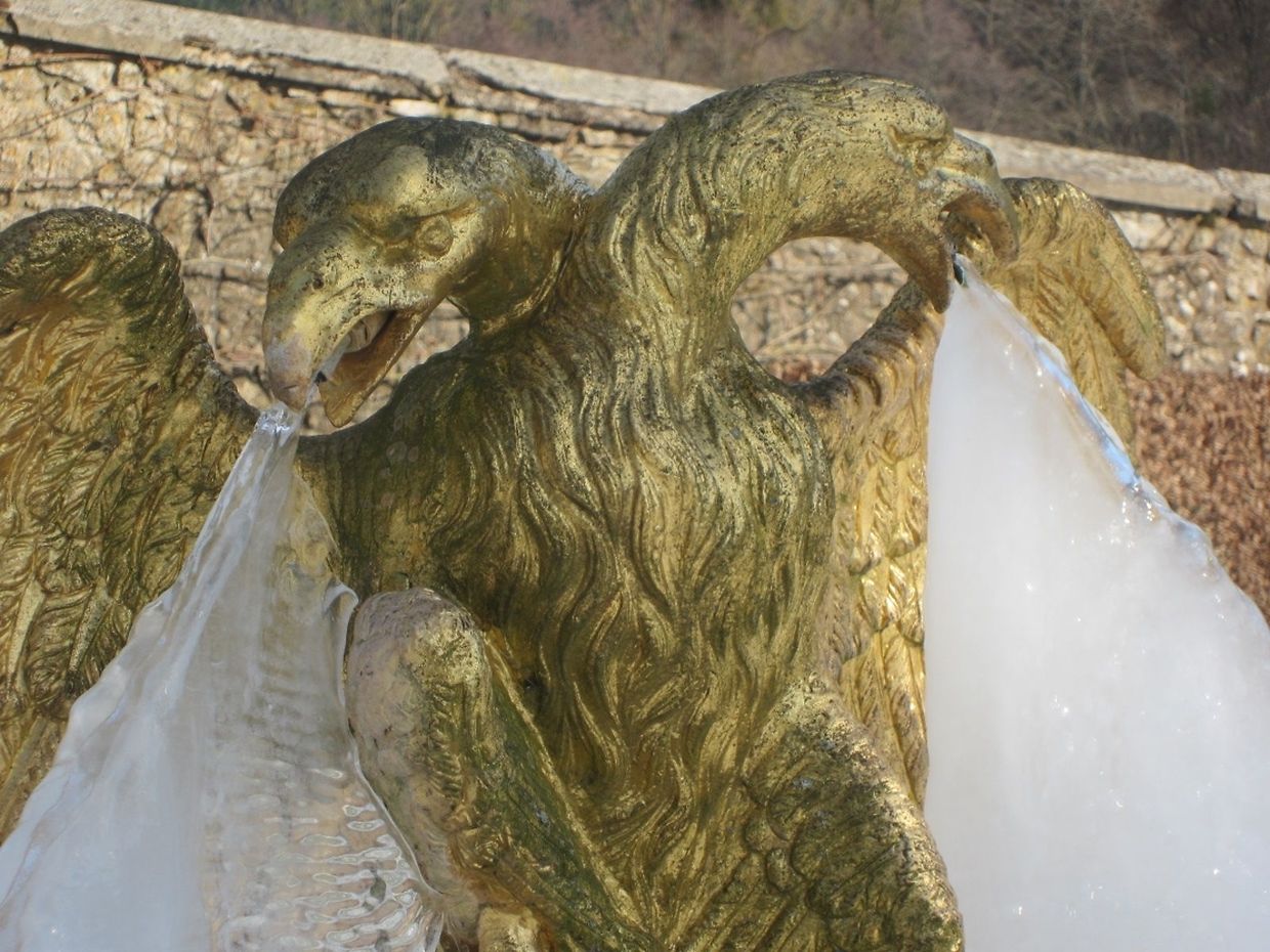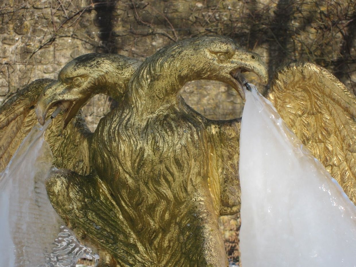 Auch der doppelköpfige Adler, der bei normalen Temperaturen aus seinen beiden Schnäbeln nur dünne Wasserstrahlen ausspeit, trägt nun einen enormen "Bart" aus Eis.