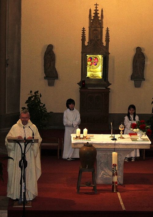 Dominica in albis, auch Klein-Ostertag oder Kleinostern genannt, ist der Sonntag nach Ostern. Der zu diesem Tag passende Antiphon, dessen Worte beginnen mit den Worten, “Quasi modo geniti infantes”, wurde dann auch anfangs des feierlichen, von Bischofsvikar Georges Hellinghausen zelebrierten Hochamtes, gesungen.