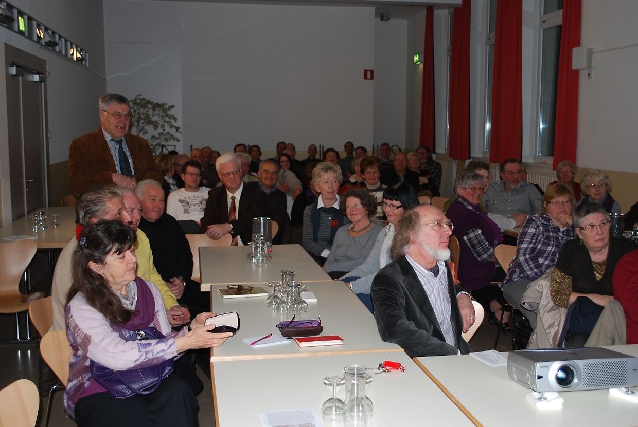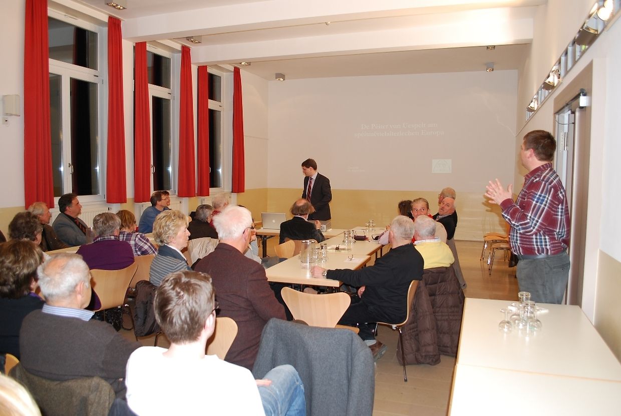 Als kréinenden Ofschloss vun dëser Versammlung kruten duerno déi vill Gäscht eng Konferenz presentéiert. Geschwat huet den Här David Kirt, dee viru kuerzer Zäit seng Doktoratsoarbecht iwwer de Péiter vun Uespelt matt Erfolleg ofgeschloss huet, an dofir jo och de richtege Mann op der richteger Plaz woar, fir zu Uespelt iwwer de Peiter vun Uespelt ze schwätzen. Esou kruten dann och d’Nolauschterer an enger geraafter awer gutt verständlecher, duerch d’Projektioun vun Zäitdokumenter, illustréierter Duerstellung e méi déiwen Abléck a munnech eng vun de fachleche Kompetenze vun deem Multitalent an och an eng Rei vu verschiddene Virgäng an Evenementer aus senger Zäit, wou hie vu Basel, Mainz oder Prag aus dran implizéiert woar. A wann een da vum Conférencier bewise kritt wéi de Péiter matt Poopst a Keeser, genau esou wéi matt Kinneken a Fürsten aus verschiddene Länner traktéiert huet, da läit et einfach op der Hand, datt hien eng wierklech europäesch Gréisst gewiescht muss sinn. Duerch Schrëft a bildlech Duerstellung ass de Péiter, an dat net nëmmen hei am Land, op Grond vu senger deemoleger Ausstralung och haut nach voll op der Tapéit. Och wier et deemno eng wierklech Kréinung, wa fir hien, deen als Biergerlechen ënner elauter Adlege gewierkt huet, och an deem Duerf, vun deem hien de Numm gedroen huet, nët nëmmen duerch e Stroossennumm, fir eng permanent illustrativ Erënnerung, déi sech weise léisst, gesuergt giff ginn.