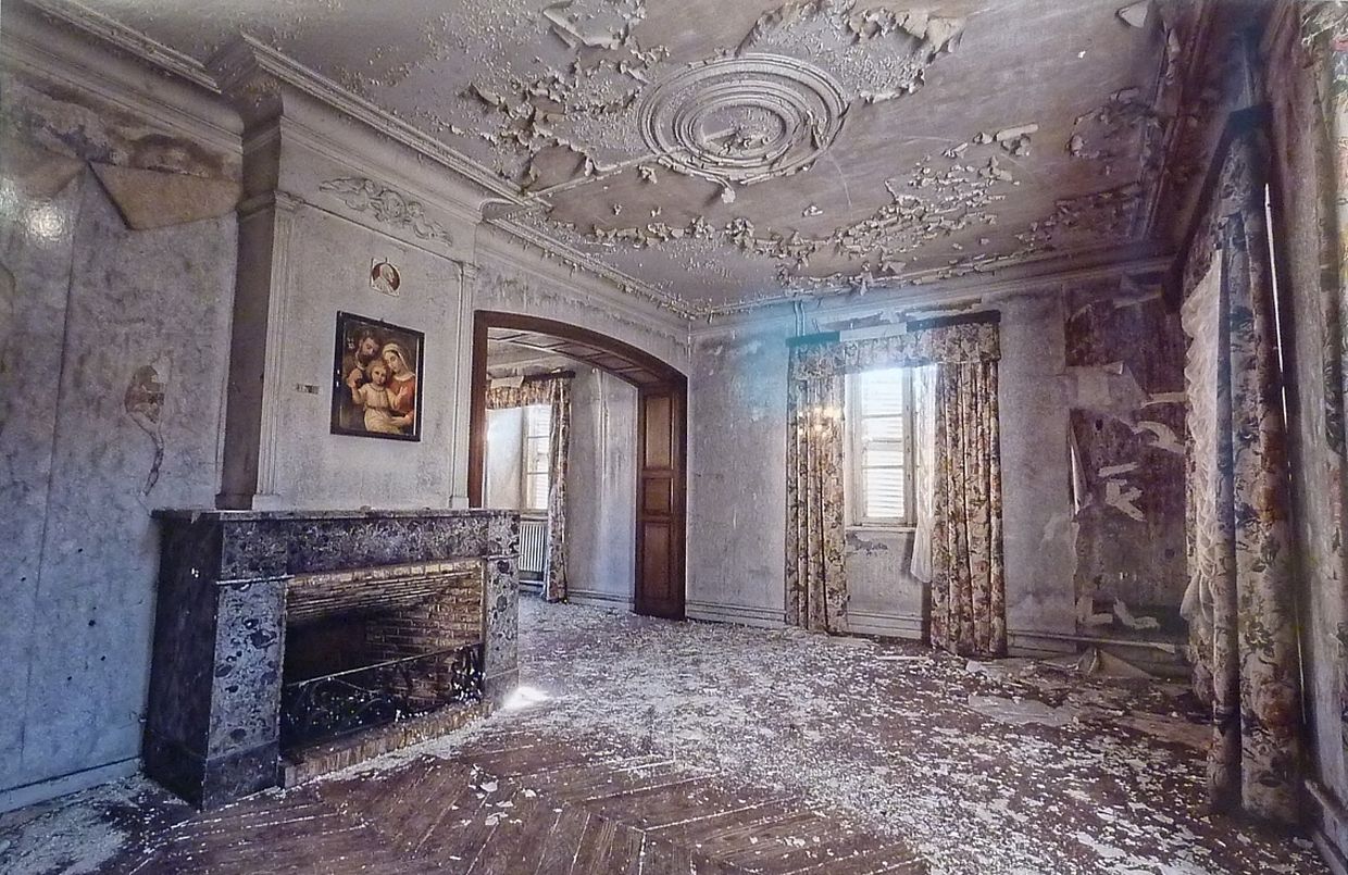 Die gezeigten Fotos wird man natürlich je nach Parteilichkeit interpretieren. Aus gut gemeinter Sicht dokumentieren die beiden ersten Fotos natürlich nur die handwerklichen und finanziellen Investitionsmöglichkeiten, die sich hier für die Allgemeinheit erschließen. Emotional, wie etwa aus der Sicht der Geusen, kann ja nur die irreführende negative Vorstellung der unverantwortlichen Vernachlässigung und des selbstverschuldeten Verfalls ausschlaggebend sein; parteiisch, wie wenn’s um Wahlen gehen würde. Und dann der Galgenhumor um das Ochsenauge über dem rekonstruierten Scheunentor. Ist nicht eines der kennzeichnenden Merkmale des Menschen gegenüber dem Tier der aufrechte Gang; und warum sollte also eine Ochsenauge über einem Portal nicht auch aufrecht stehen? Nur weil das Auge beim Ochsen horizontal steht? Ist kein Argument! Ein Ochse ist halt ja kein aufrecht gehender Mensch! [ Bild 1: Vogelperspektive des Aspelter Schlosses um 2008 (Foto S. Frantzen) – Bild 2 :de Martiny Wohnzimmer nach etwa 8 heizungslosen Jahren (Foto Gemeindearchiv) – Bild 3 : Restauriertes Scheunentor mit um 90° verdreht daneben geratenem Ochsenauge. (Foto René Neyen)]