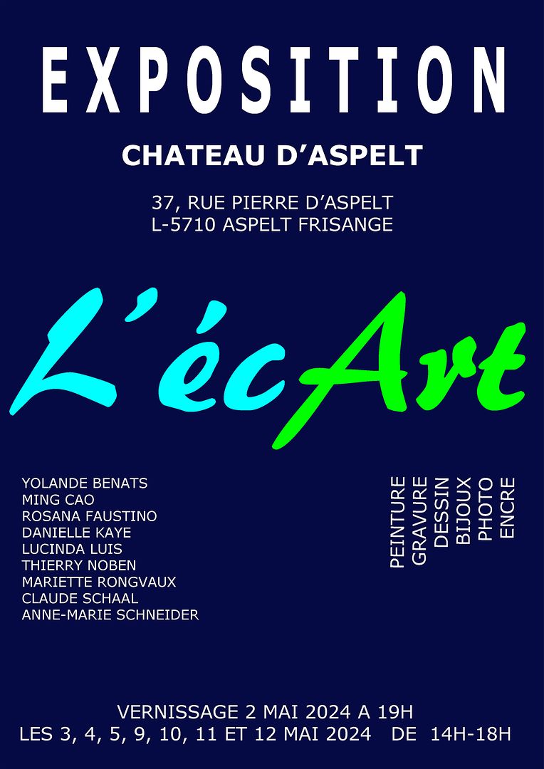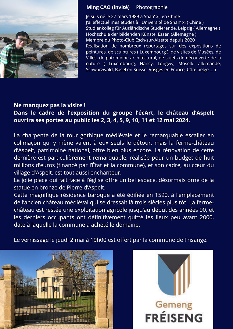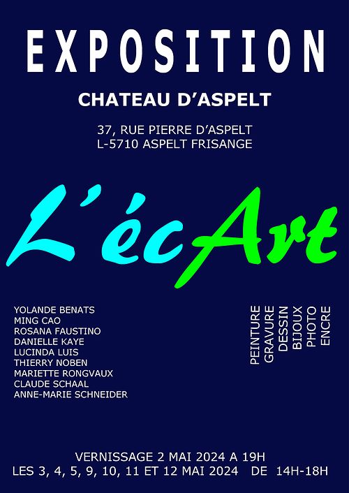 Ne manquez pas la visite ! Dans le cadre de l’exposition du groupe l’écArt, le château d’Aspelt ouvrira ses portes au public les 2, 3, 4, 5, 9, 10, 11 et 12 mai 2024.