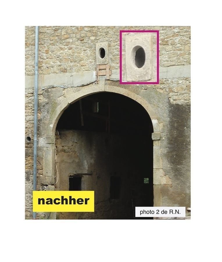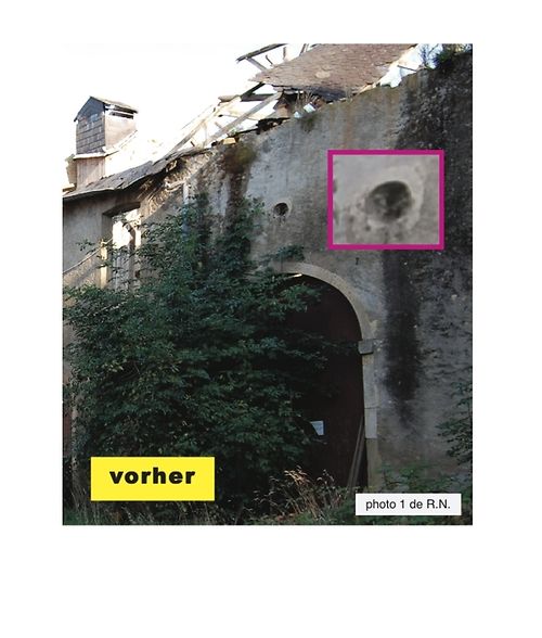 So wie es Johann dem Blinden im 14. Jahrhundert infolge chirurgischer Eingriffe durch drei sich selbst überschätzende Ärzte ergangen ist, so Ähnliches ist jetzt im 21. Jahrhundert über das Aspelter Schloss hereingebrochen. Die längst überfälligen Eingriffe zur Wiederinstandsetzung der verwahrlosten Wirtschaftsgebäude des Schlosses werden im Februar 2010 unter der Verantwortung der drei Gemeindeväter des Bürgermeister- und Schöffenkollegiums der Gemeinde Frisingen endlich in Angriff genommen. Was fatalerweise kommen musste, kam dann auch prompt. Für das Dach über den Stallungen verläuft die Erneuerung annehmbar normal, dies nach langer, langer und peinlicher, peinreicher Operation, halt wie so gemeindeüblich. Aber, oh Schreck, totales Fiasko an den beiden Oculi, d.h. Augen. Nun glotzen diese, unnatürlich schielend aus den Wandungen der Stallungen hervor. (Fotos 1-2, Scheunentor im Innenhof; Fotos 3-4, straßenseitiges Oculus in der Wand des Schweinestalls.)