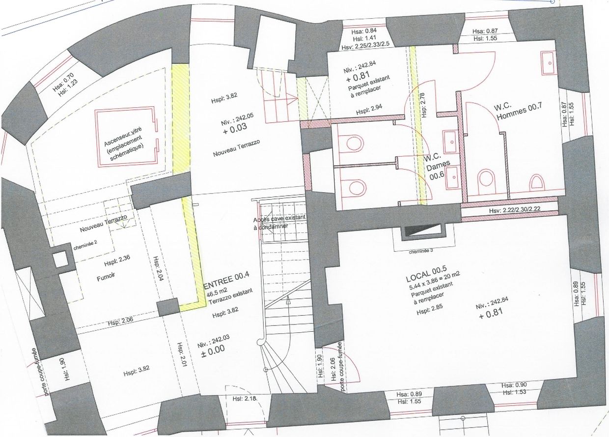 Der hier im Bild wiedergegebene Auszug aus den entsprechenden Plänen zeigt die Aufzugs- und Toilettenanordnungen im Erdgeschoss des Martiny Anbaus. Es ist gewusst, dass das Aspelter Schloss eher nur ein Schlösschen ist und lediglich etwa 155 qm innere Bodenfläche (davon kaum 110 qm Wohnfläche) pro Stockwerk aufweist. Die vorgesehenen Implantate benötigen grob 30 qm, also etwa ein Fünftel der Gesamtfläche und mehr als ein Viertel der Wohnfläche - Dachboden außer Betracht gelassen - was nicht tragbar ist. Nicht tragbar ist auch, dass einerseits eine der Turmecken und die Hälfte des Martiny Wohntraktes für total zweckentfremdende und museal absolut unpassende Einrichtungen verloren gehen und dass andererseits sehr aufwendige, unwiderruflich denaturierende Eingriffe an den Turm-, Zimmer- und Bödenkonfigurationen vorgenommen werden müssen.
