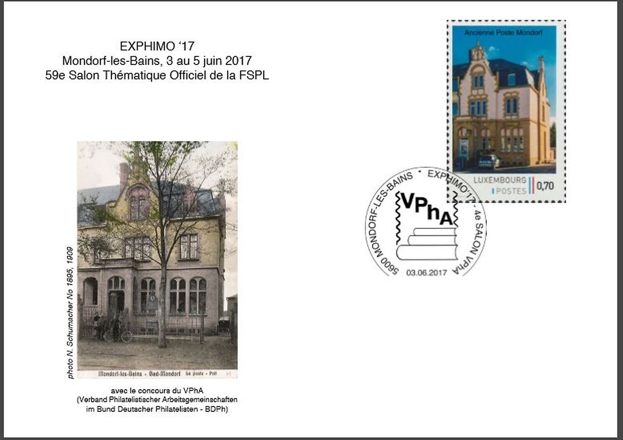 Vom 3. bis 5. Juni 2017 findet in Bad Mondorf die alljährliche thematische Briefmarken-Ausstellung der FSPL (Fédération des sociétés philatéliques du Grand-Duché de Luxembourg) im Sportszentrum "Roll Delles" ,avenue des Villes Jumelées in Bad Mondorf statt. Sie wird organisiert vom Verein Philcolux unter der Leitung von Roger Thill, Präsident der Philcolux. An der diesjährigen Exphimo beteiligen sich Aussteller aus verschiedenen europäischen Ländern. Die 59. Auflage steht unter dem Thema "Salon Philatélique & 1-Rah-men Teamwettbewerb". Die Ausstellung wird in enger Zusammenarbeit mit dem VPhA und den internationalen Arbeitsgemeinschaften organisiert. Anlässlich dieser internationalen Ausstellung findet ebenfalls der vom Verband Philatelistischer Arbeitsgemeinschaften im BDPh organisierter 4. Ein-Rahmen-Teamwettbewerb für BDPh-Arbeitsgemeinschaften statt. Die Ausstellung ist offen für alle thematischen Ein-Rahmen-Exponate im Wettbewerb sowie thematischen Sammlungen der allgemeinen Wettbewerbsklasse für FSPL- Mitglieder, dies im Rahmen der nationalen Ausstellung der FSPL für thematische Philatelie. Die Aussteller von der FSPL welche bei dieser Ausstellung eine Vermeil Medaille im Wettbewerb erhalten, können sich an allen FIP (Weltbriefmarkenausstellungen) beteiligen.