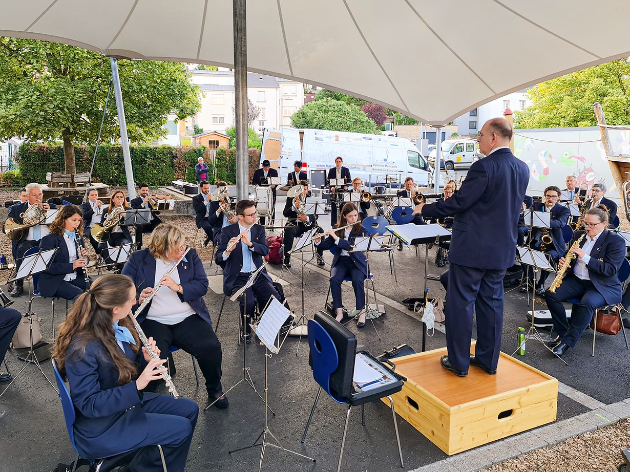 Die Harmonie, welche an drei Abenden im Freien geprobt hatte, spielte unter Leitung von Olivier Gravier, ein leichtes Unterhaltungsprogramm mit Melodien von Udo Jürgens, Phil Collins, Helene Fischer, usw.