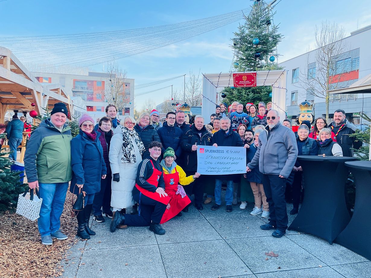 Bad-Mondorf Scheck Iwwereechung vum Munnerefer Chrëschtmaart .. Administration Communale Veröffentlicht am Montag, 18. Dezember 2023 um 15:14 Mondorf-les-Bains, Luxembourg D’Gemeng Munneref huet de kompletten Erléis vun de Standgelder vum Chrëschtmaart un d’Stroossenengele gespent. E grousse Merci un all d’ Participanten vum Chrëschtmaart Unpassenden Inhalt angeben Weitere Neuigkeiten von .. Administration Communale > Munneref : Conveniat vun de Joergäng 1952-1956 25.10.23 Bad-Mondorf Scheck Iwwerreechung vum 30. Munnerefer Chrëschtmaart 21.12.22 Bad-Mondorf Mondorf-les-Bulles - Presentatioun vun enger BD 05.12.22 Bad-Mondorf Nohaltegkeet mécht Schoul 09.11.22 Bad-Mondorf Jugendaustausch zu Munneref (23.-29. Juli 2022) 12.08.22 Bad-Mondorf