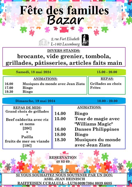 l'Asbl Jean Heinisch et la Paroisse du Sacré-Cœur Lux-Gare, organiseront prochainement leur traditionnelle Fête des familles & Bazar.
