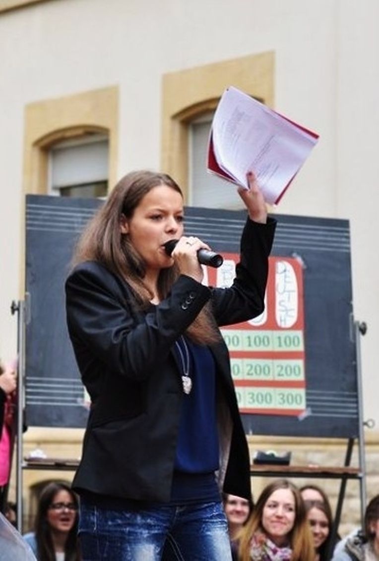 Ansonsten bestand die Veranstaltung vor allem aus zwei Teilen, einem Staffellauf, bei dem es mehrere Etappen, wie zum Beispiel gemeinsames Sackhüpfen zu viert, zu bestehen gab und einem Quiz, „Question pour un prof“ genannt. Auch wenn es sich anfangs schwierig erwies genügend motivierte Professoren und Professorinnen anzutreffen, so boten die freiwilligen oder auch überredeten Teilnehmer eine interessante Show. Mit lustigen Tanzeinlagen und der passenden Musik kam dann auch immer wieder gute Stimmung auf. Schlussendlich bedankten sich die Schülerinnen bei allen Angestellten der Schule und wie die Tradition es wünscht, durfte auch die „Hymne“ des Fieldgen „Un cri de joie, Magnificat!“ nicht fehlen.