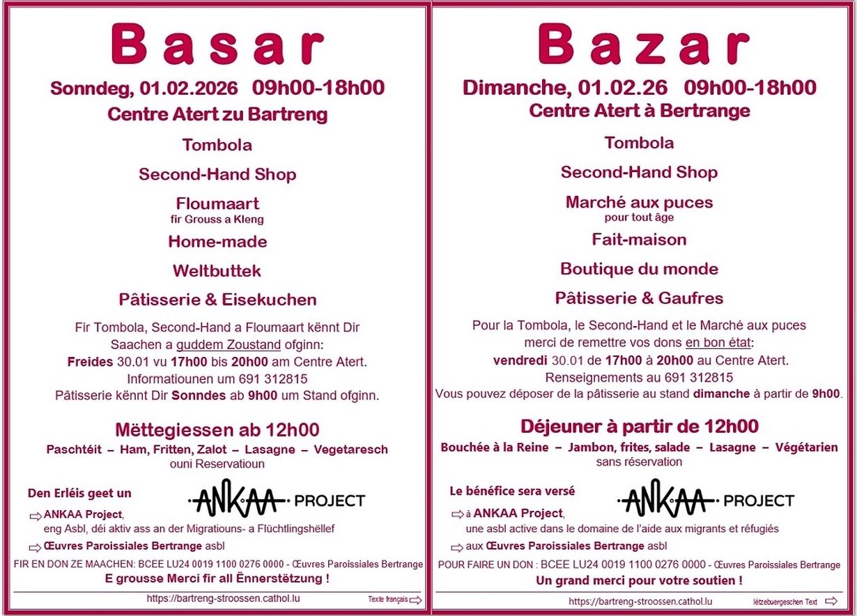 Geschwënn ass erëm den traditionelle Basar am Centre Atert zu Bartreng. Um Flyer fannt Dir déi néideg Informatiounen. Mä et ass deen Dag nach méi do ze fannen wéi dat, wat um Flyer ugekënnegt ass.