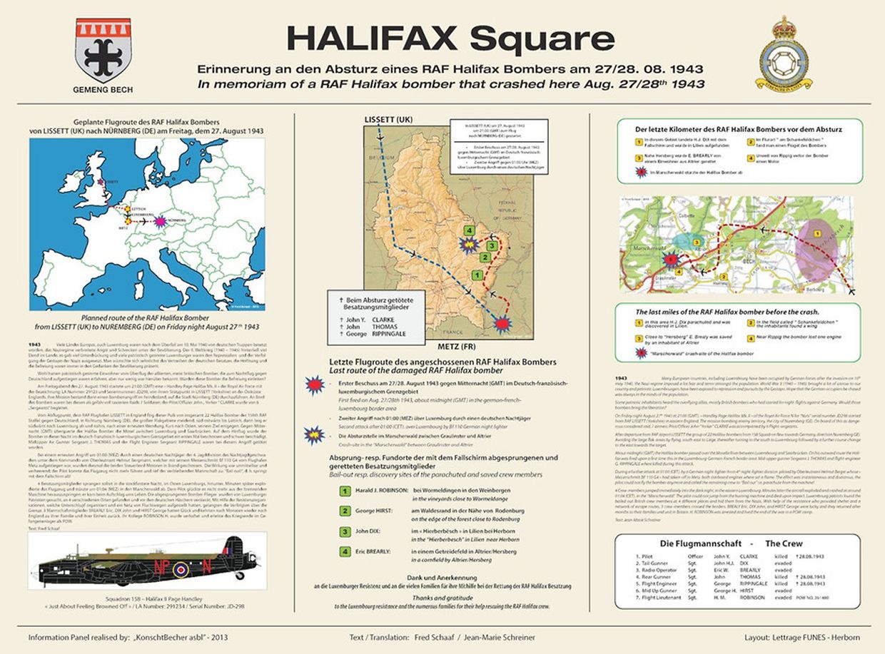 Zahlreiche Flugzeuge der RAF wurden von der deutschen Flak getroffen, als sie nachts über luxemburgischem Gebiet flogen, vor allem, wenn sie sich den Grenzen des deutschen Festlandes näherten, um ihre Ziele zu erreichen. Einige stürzten in Luxemburg ab, andere mussten notlanden. In zahlreichen Fällen konnten RAF-Besatzungen, die im luxemburgisch-deutschen Grenzgebiet von Flak getroffen oder von deutschen Abfangjägern beschossen wurden, rechtzeitig mit dem Fallschirm abspringen und sicher auf dem Boden landen, während andere bei einem Absturz ums Leben kamen.