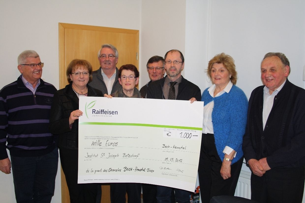 Alle Jahre wieder . . . . . verteilen die Vereine einen Teil ihrer Einnahmen an eine wohltätige Organisation. Sie möchten die, bei ihren Veranstaltungen eingenommenen Gelder nicht nur zu ihrem eigenen Vergnügen verwenden und haben ein Mitgefühlt für andere, weniger glückliche Menschen. Es war heuer zum 7 Male, dass sie einen Scheck an eine Luxemburger Organisation übergaben, dort wo sie hoffen, dass ihr Geld in Luxemburg verwandt wird. Dieses Jahr überreichten beide Vereine einen Betrag von 1000 € an das Institut St. Joseph aus Betzdorf. Der Scheck wurde von Hr. Laurent Mersch dankend in Empfang genommen.