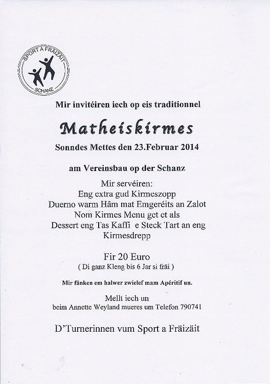 Bech Matheiskirmes op der Schanz Tilly Housse-Roth Veröffentlicht am Samstag, 8. Februar 2014 um 16:46 D'Turnerinnen vum Sport a Fraizait invitéieren op hier traditionnel Matheiskirmes an de Vereinbau op d'Schanz Unpassenden Inhalt angeben Weitere Neuigkeiten von Tilly Housse-Roth > Biller - a Konschtausstellung 14.06.13 Bech Matheiskirmes op der Schanz 13.02.13 Bech