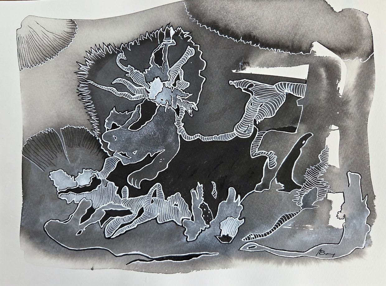 Josée Bourg a fait le choix de travailler avec l’encre de chine, médium utilisé depuis des millénaires en écriture ou en peinture. L’encre se distingue par son intemporalité et l'étendue des possibilités qu’elle peut offrir. Celle-ci est utilisée, soit pure révélant de profondes intensités, soit diluée à l’eau, offrant une infinité de nuances de gris, du plus léger au plus profond. Ce qu’on appelle des lavis. Ceux-ci enrichissent les œuvres avec la transparence, dévoilant les volumes et insufflant une intention et une lumière particulière, permettant à l’artiste de créer des compositions riches en contrastes. L’encre est un moyen d’expression entre subtilité et force, offrant un large champ des possibles, pouvant aller du simple trait net à la subtilité des dégradés. C’est pour cette raison que Josée Bourg a adopté ce médium artistique, afin d’exprimer au plus près ses ressentis.