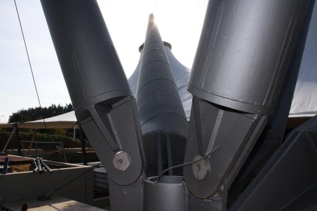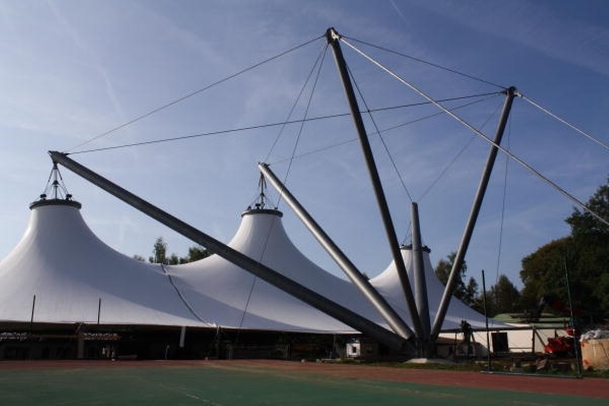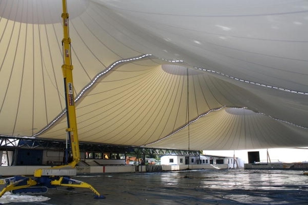 „Die Dachfläche ist in drei konisch geformte Hochpunktelemente gegliedert, die in der sattelförmigen Kehle gestoßen und zu einer zusammenhängenden Großform zusammengefügt sind“, erklärt Architekt Michael Kiefer von der ausführenden Firma Kiefer. Textile Architektur (K.TA) aus Radolfzell am Bodensee. „Die Hochpunktringe aus Rundstahl werden an einem Tragwerk aus Pylonen mit einer Anzahl von Seilen abgehängt“, beschreibt er weiter. „Schräg von außen neigen sich die drei Hauptpylonen über die Hochpunkte der Dachfläche. Sie werden jeweils zu zwei kleineren fast gerade stehenden Pylonen gespannt und von dort zu den Gründungsfundamenten.“ Die überdachte Fläche beträgt rund 2 400 Quadratmeter. Damit sind die komplette Eisfläche und der umgebende parallel zur Bahn verlaufende Umgang überdacht.