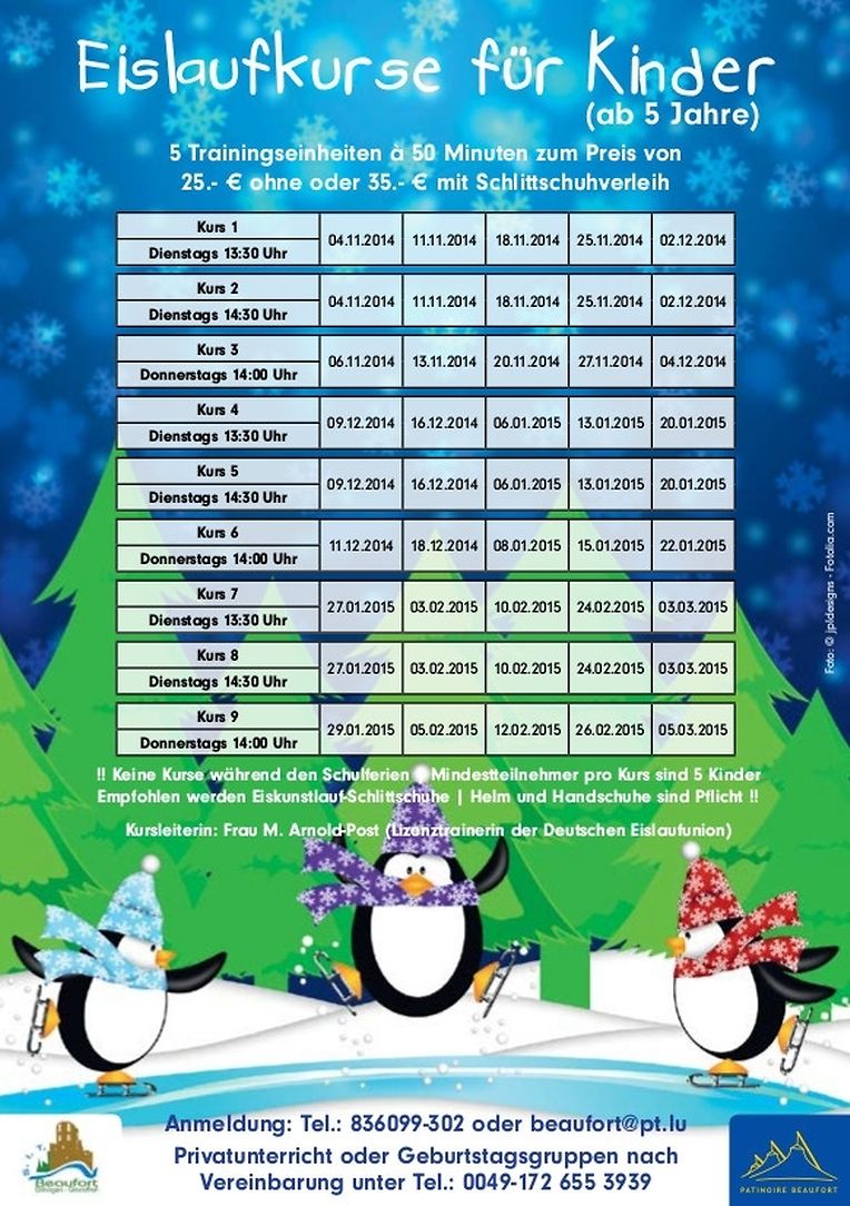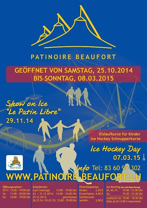 Et ass souwäit : e Samschdeg, 25. Oktober 2014 um 11 Auer geet d‘Beeforter Äispiste nees op. Ënnert dem imposanten Zeltdaach sinn da rëm Schlittschong fueren an Ice Karting ugesot. Mir bidden dëse Wanter och Schlittschongcourse speziell fir Kanner un.