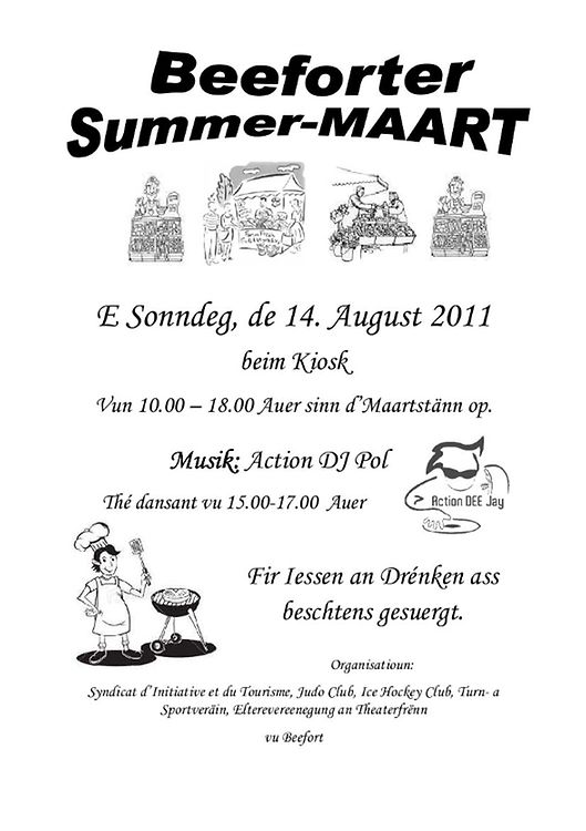 De „Syndicat d’initiative et du tourisme“, de Judo Club, den Ice Hockey Club, den Turn- a Sportveräin, d'Elterevereenegung an d'Theaterfrënn vu Beefort invitéieren e Sonndeg op de Beeforter Summermaart beim Kiosk.