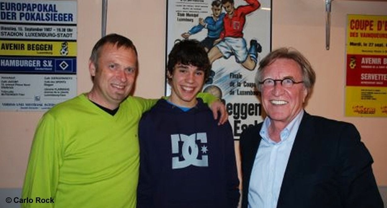 [ Foto: den Trainer Jos Steffen an de President Jean Hansen vum FC Avenir zesumme mam 16-jähregen Débütant Marlon Rock ]