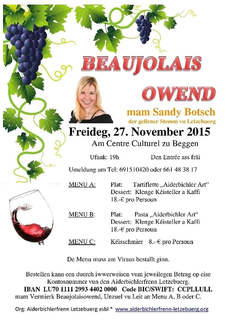 Luxemburg - Beggen Fotogalerie Beaujolais-Abend in Beggen Aiderbichlerfrenn Lëtzebuerg 136 Bildergalerie Bitte scrollen Sie nach unten,um weitere Bilder zu sehen. Veröffentlicht am Montag, 30. November 2015 um 11:23 Am 27.11.2015 organisierten die Aiderbichlerfrenn Letzebuerg ihren ersten Beaujolais-Abend im Kulturzentrum Beggen. Neben vegetarischer Tartiflette, Pasta Bolo und Käsebrote gab es gute musikalische Stimmung von Sandy Botsch, der goldenen Stimme Luxemburgs Ein herzliches Dankeschön an die Fotografen Tom Jean und Sharon Shanet. Unpassenden Inhalt angeben Weitere Neuigkeiten von Aiderbichlerfrenn Lëtzebuerg > Zillertaler Haderlumpen live in Luxemburg im Rahmen ihrer Jubiläumstournee 14.03.17 Luxemburg - Dommeldingen Aktion "Hund im Backofen" 19.07.16 Luxemburg - Pfaffenthal Zillertaler Haderlumpen und Sandy Botsch im Kulturzentrum in Wasserbillig 31.05.16 Wasserbillig Zillertaler Haderlumpen und Sandy Botsch im “Miseler Land” 02.05.16 Wasserbillig Kölle Alaaf mit den Dompiraten & Sandy Botsch 06.03.16 Luxemburg - Dommeldingen