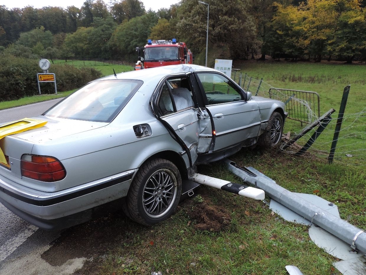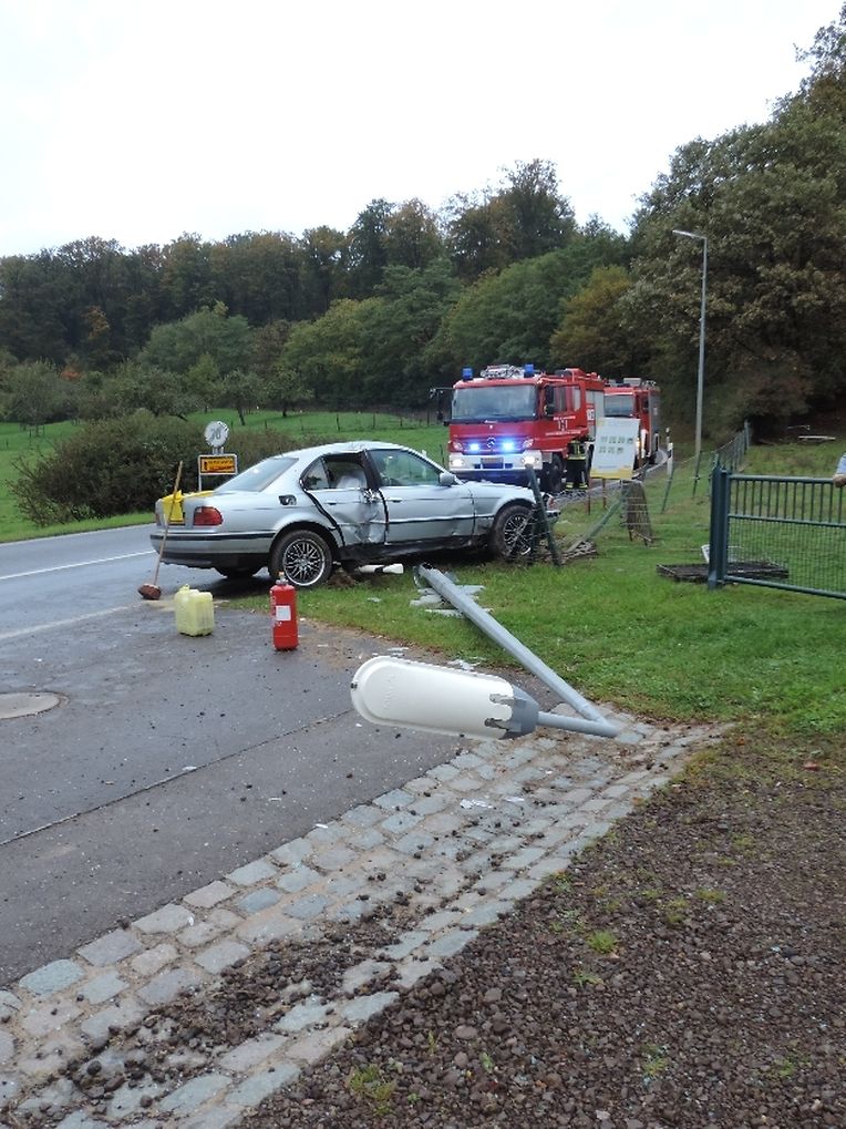 Die Laterne konnte dem Wucht des Aufpralls nicht standhalten und fiel um. Ebenso wurde der Benzintank des Fahrzeuges aufgerissen. Da dieser erst kurz zuvor gefüllt wurde, musste der Kraftstoff von der Feuerwehr Junglinster aufwendig umgepumpt werden. Danach musste noch die Strasse ausgiebig gereinigt werden. Am Fahrzeug entstand erheblicher Sachschaden.