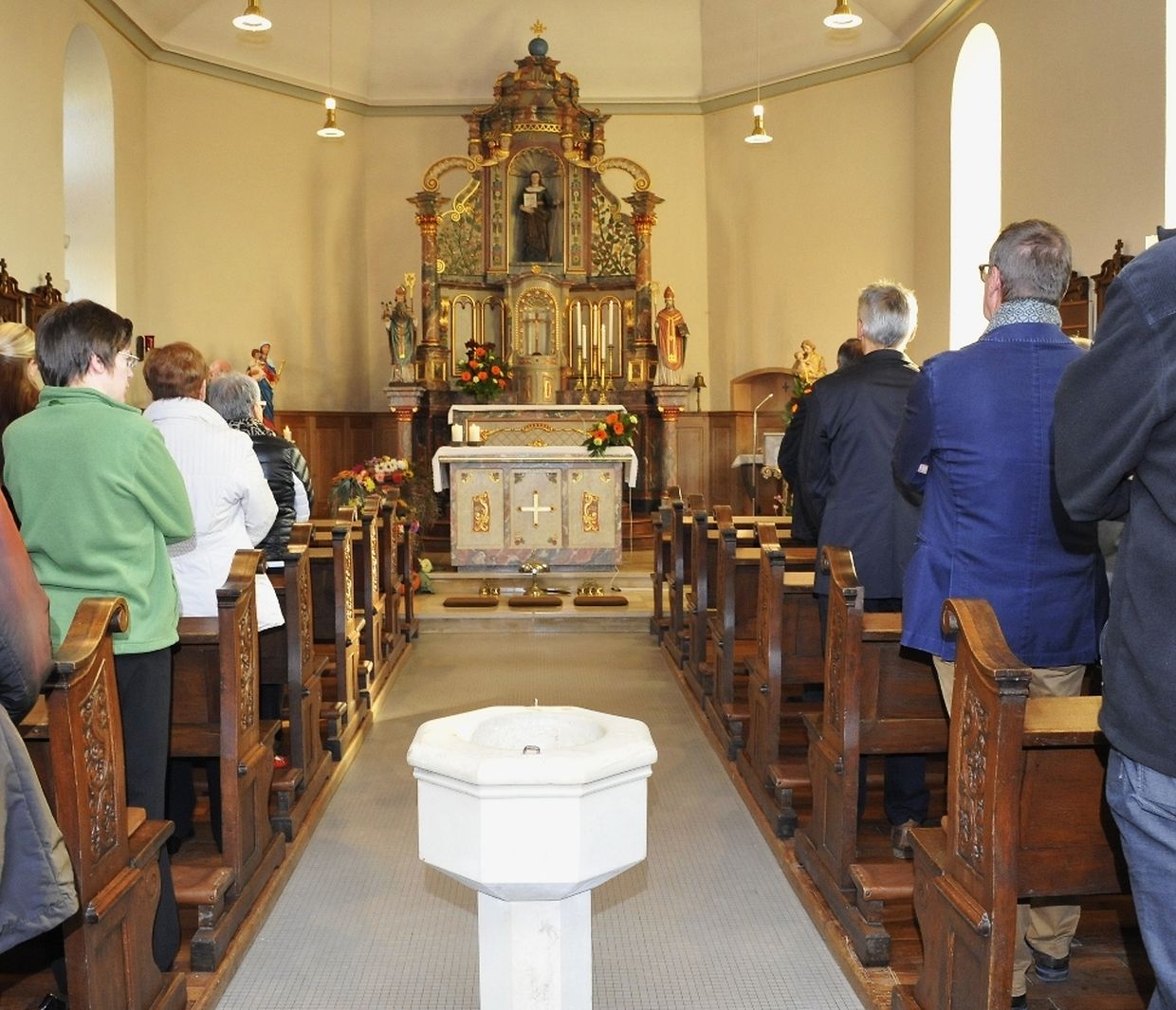 Mit dem Erntedankfest wird an die Dankbarkeit vom Ertrag der Landwirtschaft und Gärten erinnert. Dekorativ wurden die landwirtschaftlichen Feldfrüchte, Getreide, Obst und Gemüse in der Kirche aufgestellt, und gesegnet. Dieses traditionelle Fest fand neulich in der Dorfkirche von Beiler mit einem feierlichen Gottesdienst statt, und der musikalischen Unterstützung der Chorale Ste.Cécile aus Hüpperdingen. Anschließend segnete Pfarrer Michel Meyer die vorbeifahrenden Fahrzeuge zum Gebrauch von Schutz und Heil. Unter der Organisation servierte der Kulturverein Beiler-Leithum das Mittagessen "Judd mat Gaardebounen" im Zelt am See in Weiswampach.