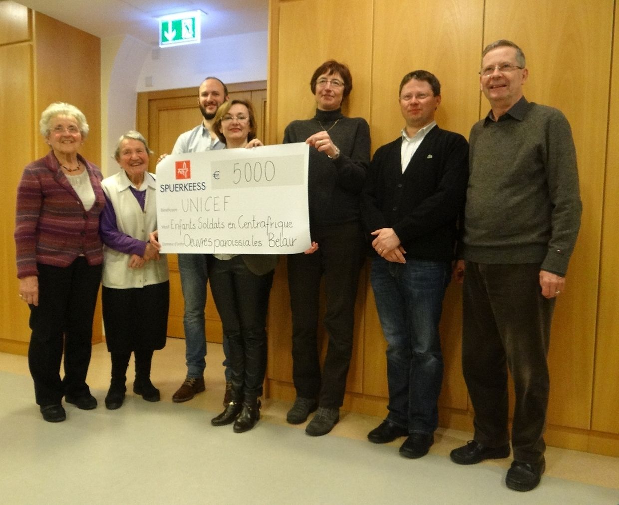 Après avoir aidé pendant plus de trente ans un Centre nutritionnel pour enfants à Bangui en RCA ,les Oeuvres paroissiales de Belair ont décidé de continuer de soutenir la Centrafrique qui sombre dans une crise sécuritaire et politique sans précédent . Un cheque de 5000 Euros, une partie des recettes du Bazar, qui a eu lieu en octobre 2014, a donc été remis a Monsieur Heber de UNICEF Luxembourg.