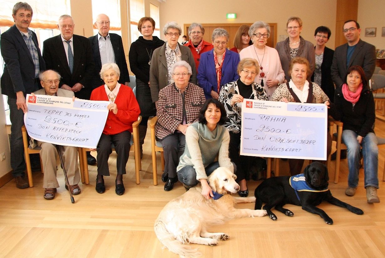 Vor einigen Tagen hatte die Leitung der „Résidence Grande-Duchesse Joséphine Charlotte“ bekannt unter dem Namen „Konviktsgaart“ zu zwei Schecküberreichungen eingeladen. Eine erste 2500-Euro-Spende, aus dem Erlös des Weihnachtsbasars, erhielt Dr. Jos Faber für die Nichtregierungsorganisation „Terre des Hommes Luxembourg“, die einerseits das Projekt „Die Zukunft gestalten, ohne die Vergangenheit aufzugeben“ für die Yanomami-Bewohner im Amazonasgebiet Brasiliens und andererseits das „Inhijambia-Projekt“ in Managua für sozialschwache Familien unterstützt. Lisette Servais mit „Baillie“ und Wies Tessy mit „Faustine“ nahmen im Namen von „Rahna – Muppen ennerstetzen Leit am Rollstull“ die zweite 2500-Euro-Spende entgegen, die teilweise dazu dienen wird die Ausbildungskosten in Höhe von jeweils 17.000 Euro für einen Hund bei der „Association Handi-Chiens“ in Alençon (Normandie) zu übernehmen. Direktor Marcello Loguerico dankte den Bewohnern und dem Personal für die Gestaltung des Weihnachtsmarktes zugunsten von „Terre des Hommes“ sowie bei Pfarrer Pit Faber, der das Opfergeld aus den wöchentlichen Gottesdienstes, das an „Rahna“ gespendet wurde. (G.L.)