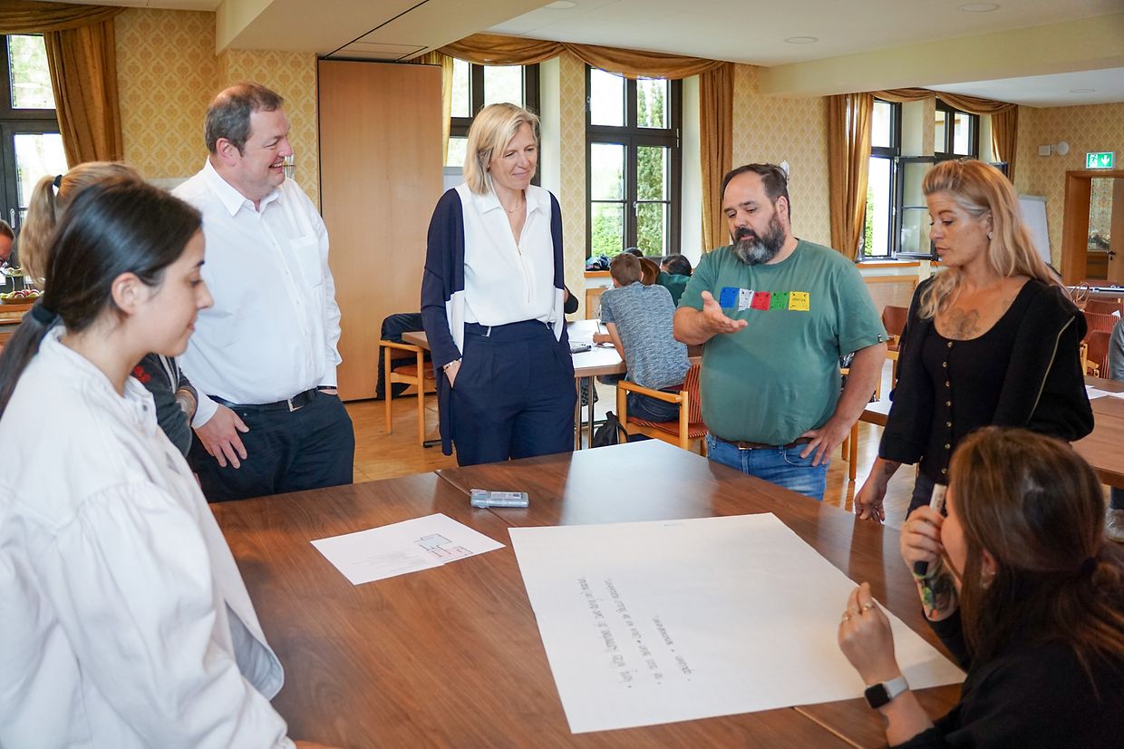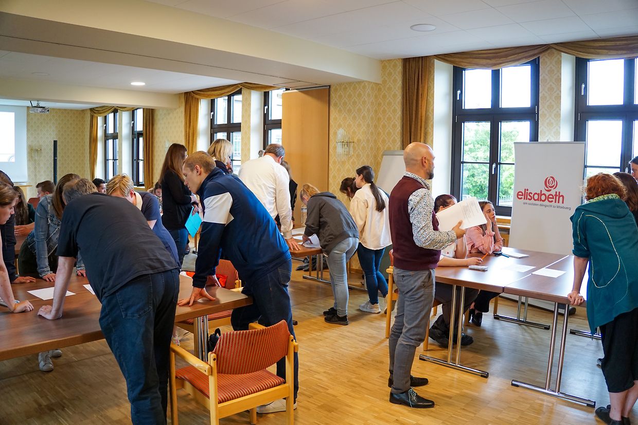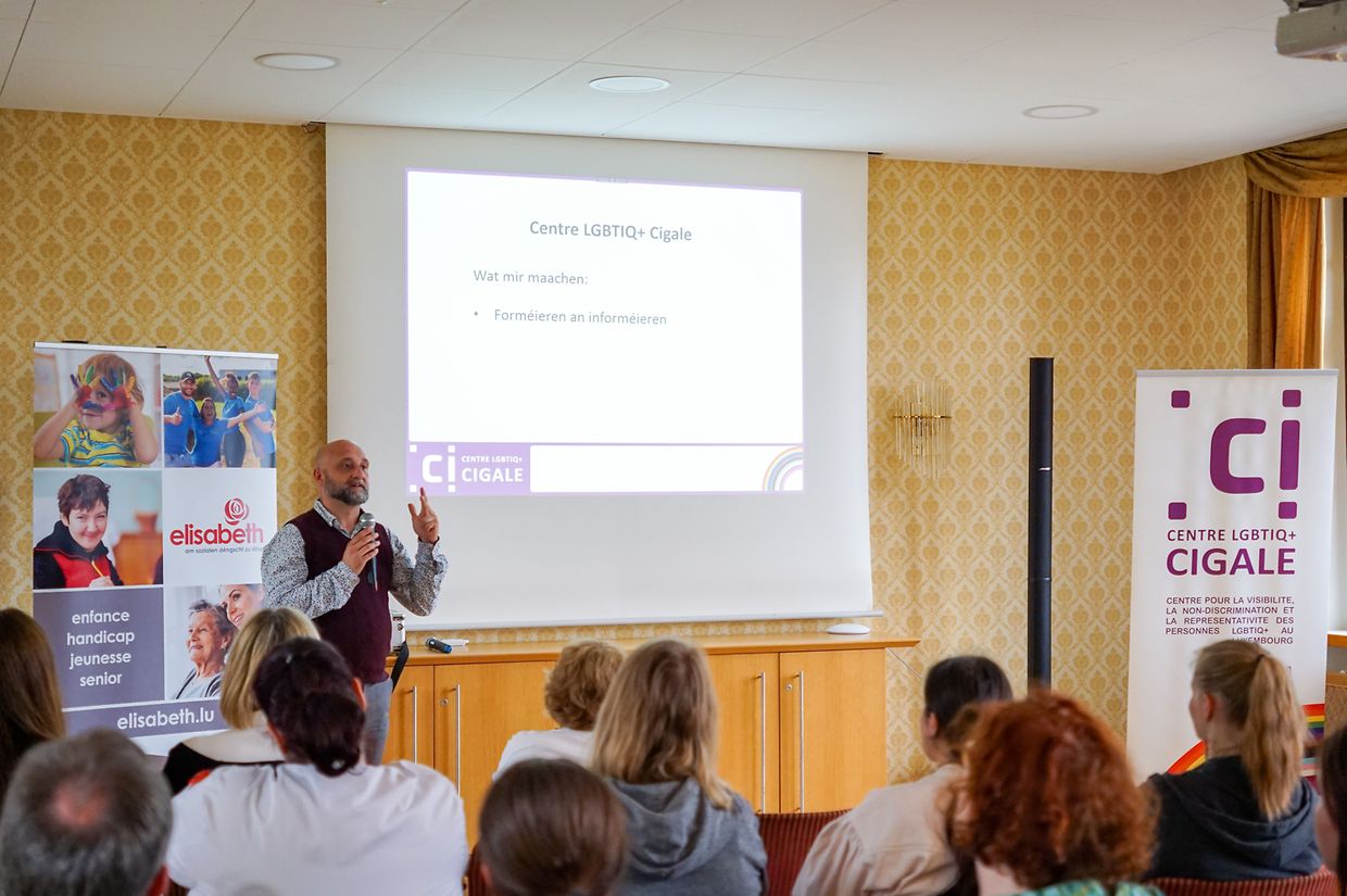 De Workshop mam Titel “Jenseits vun der Identitéit” gouf vum Didier Schneider, Direkter vum Centre LGBTIQ+ an Delégué vun der Bientraitance bei Elisabeth, souwuel wéi dem Elsa Fischbach, Pedagog*in am Centre LGBTIQ+ CIGALE, geleet. D’Mataarbechter/innen vun Elisabeth goufen dozou encouragéiert, hir Gedanken an Erfarungen ze deelen an dëst huet zu ville konstruktiven Diskussioune gefouert, déi deen een oder anere sécherlech zum Nodenke bruecht hunn.
