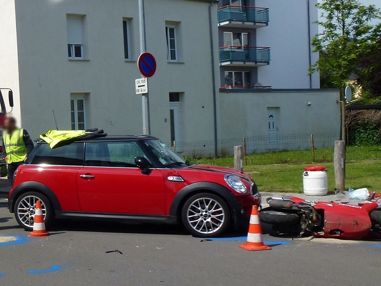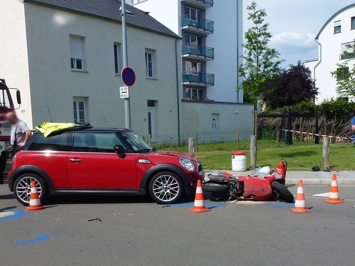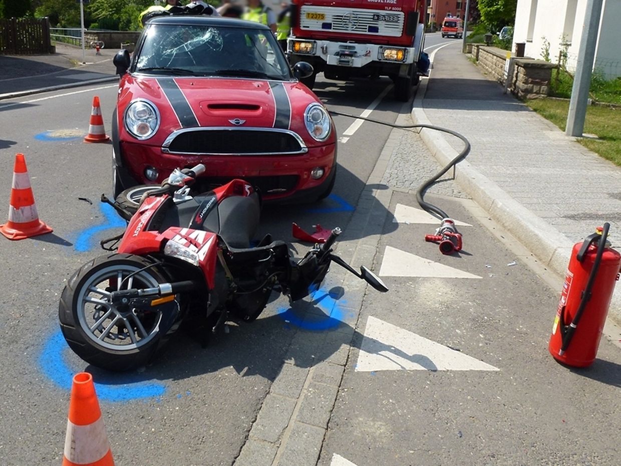Ein weiterer schwerer Verkehrsunfall am Montagnachmittag: In der "rue de Bettembourg" in Fentingen kollidierte ein Motorrad mit einem abbiegenden PKW. Der Fahrer des Zweirades wurde dabei gegen die Fensterscheibe des PKW geschleudert und schwer verletzt. Er musste vor Ort durch den Notarzt aus Luxemburg, die Sanitäter aus Bettemburg sowie die Feuerwehr Hesperingen behandelt werden. Die Straße wurde für den Verkehr gesperrt da der Mess- und Erkennungsdienst der Polizei die Spuren sichern musste. Das CIBETT war mit 4 Fahrzeugen zusammen mit den Kollegen der Feuerwehr Hesperingen und des SAMU Luxemburg im Einsatz.