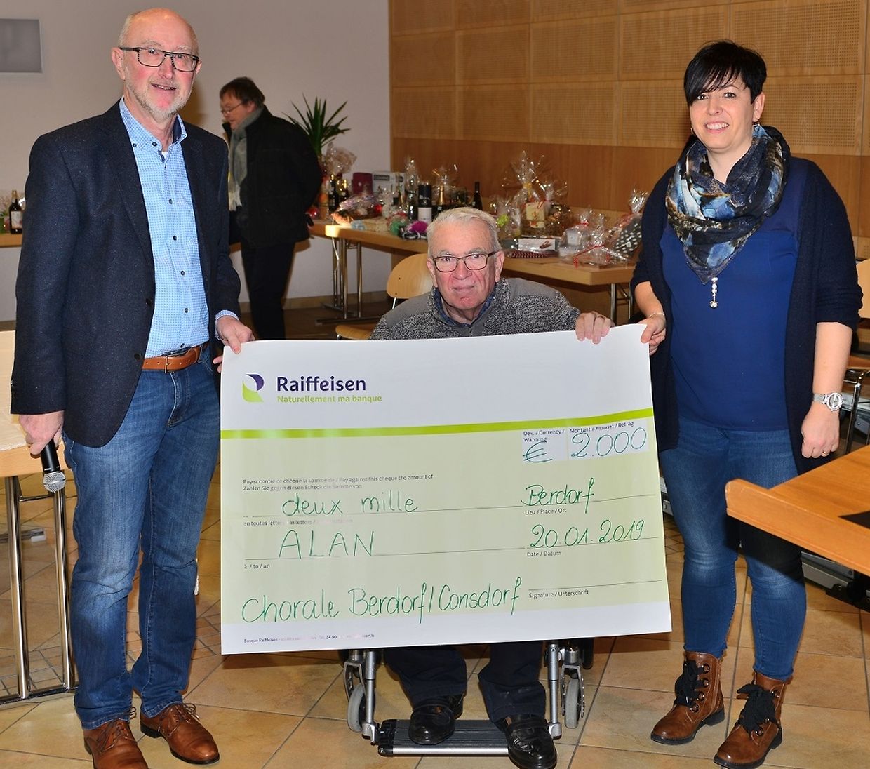 Bäi dëser Geleeënheet konnt de Bäertref-Konsdrefer Gesank der Associatioun ALAN e Scheck vun 2.000 € iwwerreechen. Dat ass den opgeronnte Betrag vum Erléis vun 2 Chrëschtconcerten 2018 zu Berbuerg an zu Präitler. Den Här Fons Ansay huet als Vertrieder vun ALAN dee Scheck dankbar entgéint geholl. ALAN ass eng Asbl, déi zu Lëtzebuerg haaptsächlech Leit hëlleft an enkadréiert, déi ënnert enger rarer Krankheet leiden. D’EU definéiert eng Krankheet als selten, wa manner wéi 5 op 10 000 Awunner an der EU betraff sinn.