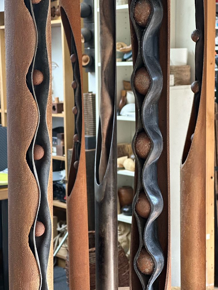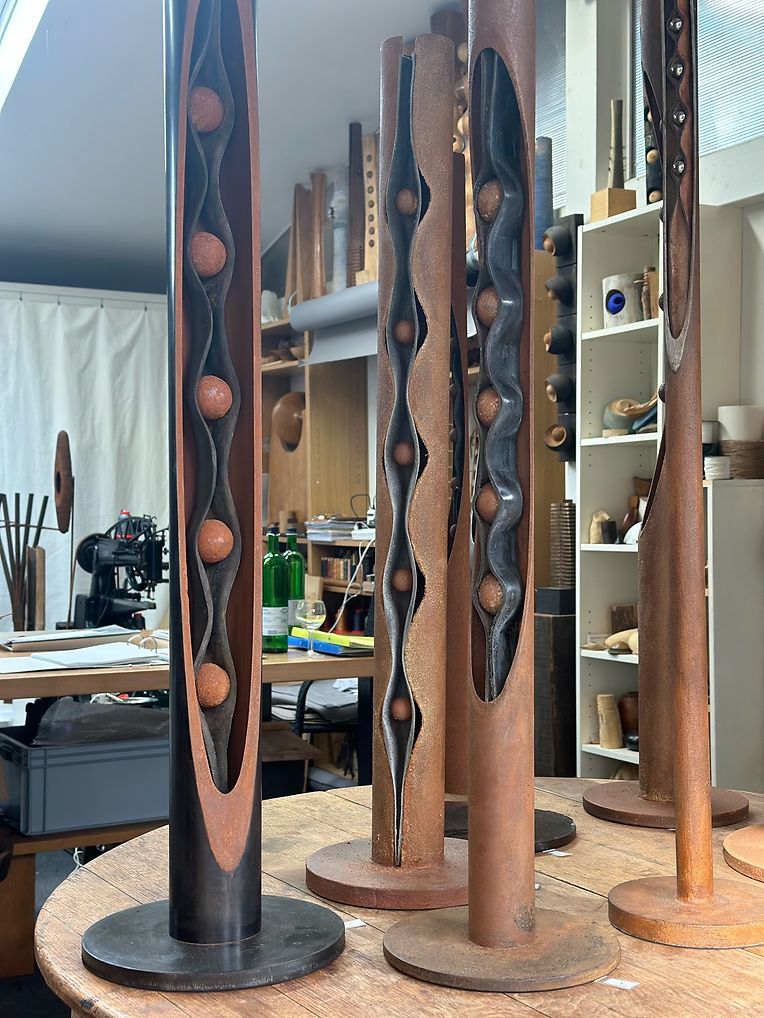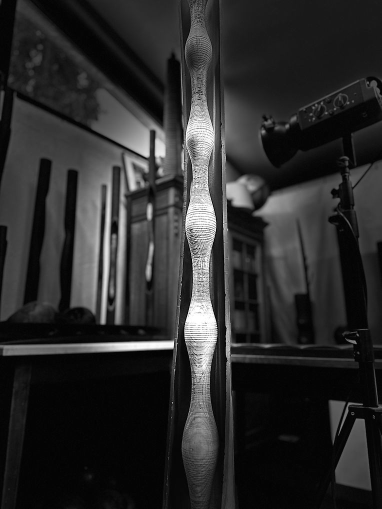 Par ici les outils multiples et intelligents, lunettes et rampes, griffes et contre-pointes, coupoirs et gouges, tronquoirs et racloirs, calibreurs et tant d’autres. Tous participent à la valse. Enveloppée par l’odeur âcre, chaude et intime du bois, Carmen coupe, forme, ponce, tourne le bois durant des heures. Elle est alors ‘ en état de transe ‘ comme elle aime le répéter.