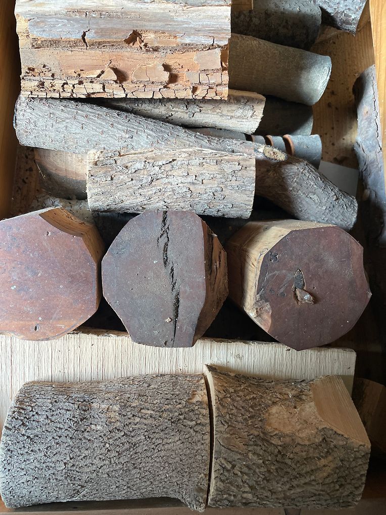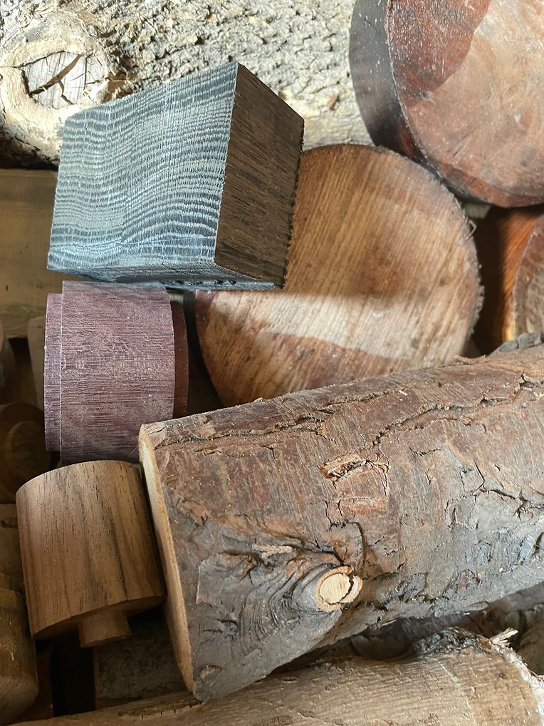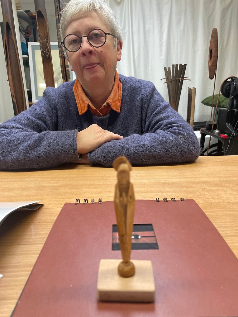 Quand elle y pénètre, le temps s’arrête. Le matériel noble parmi tous les autres, fer, cuir.., qu’elle travaille aussi avec bonheur, c’est le bois omniprésent, le bois dur, le bois tendre, ses couleurs, sa structure, ce bois glané au cours des promenades, ce bois offert, ce bois récupéré, noyer, pin, acajou, cèdre, hêtre et même un bout d’ébène ancien, aujourd’hui protégé, qui a ce fascinant pouvoir sur elle. Elle aime le bois qui l’aime de retour. Entre ses mains, elle n’est plus d’ici.