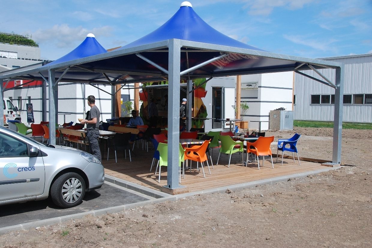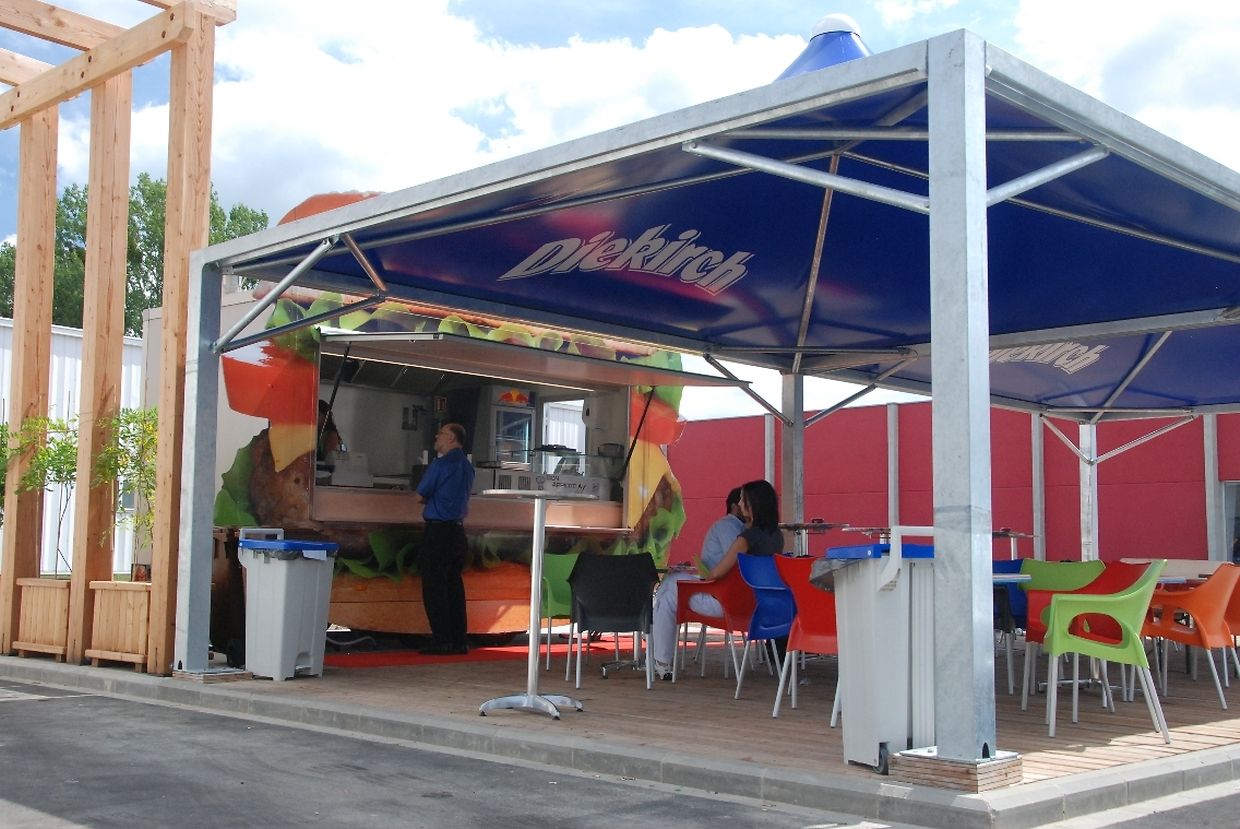 Die Holzterrasse ist komplett überdacht, sollte der Regen zwischen April und November doch einmal einsetzen. Im Winter ist Lio's Burger geschlossen. Die peppig-bunte Bestuhlung kann etwa fünfzig hungrige Gäste empfangen. Es werden in Zukunft aber noch mehr. Der Außenbereich der Q8-Tankstelle wird in Kürze noch mit Bäumen und Sträuchern begrünt und weitere zwei bis drei Holzterrassen sollen auf dem Gelände errichtet werden. So werden in etwa zwanzig weitere Kunden montags bis freitags zwischen 11.30 und 14 Uhr verweilen können. „Wenn der Andrang weiterhin wächst, werde ich 2013 versuchen meinen Imbissstand auch in den Abendstunden zu öffnen“.