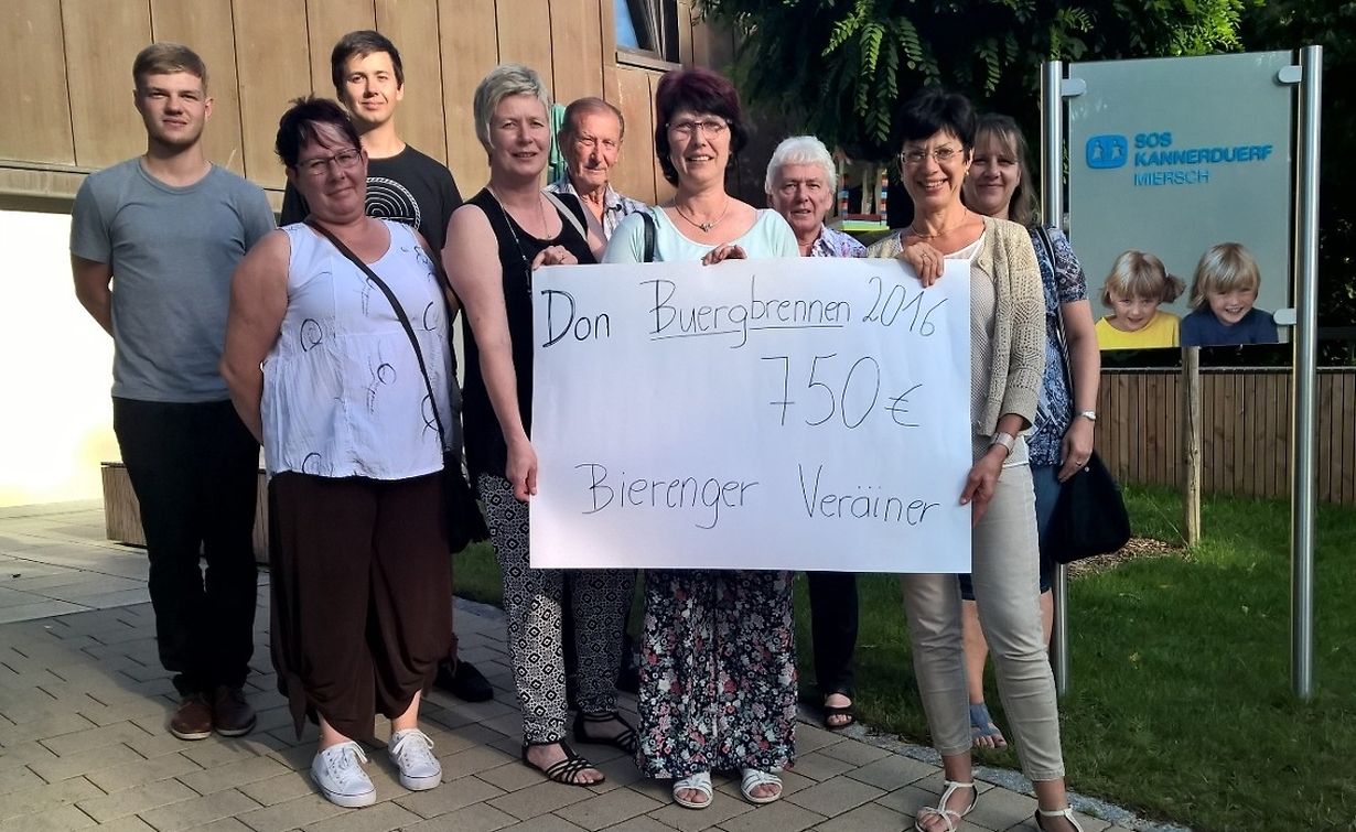Déi Bierenger Veräiner- de Gaart & Heem, d'Jugend, 5x Beringen an d'Kürbisfrënn- hunn och dëst Joer erëm no alem Brauch d'Buergbrennen um Siebelchen zu Biereng organiséiert.Vu 17.00 Auer un gouf et Ierzebulli an et war och soss fir Iessen a Gedrënks gesuergt.Ëm 20.00 Auer huet déi läscht bestuete Koppel aus dem Duerf d'Buerg ugefaang. D'Leit aus dem Duerf a ronderëm hunn dat Ganzt gudd ënnerstëtzt an esou konnten sie virum kurzem 750€ un d'Mierscher Kannerduerf iwerreechen.