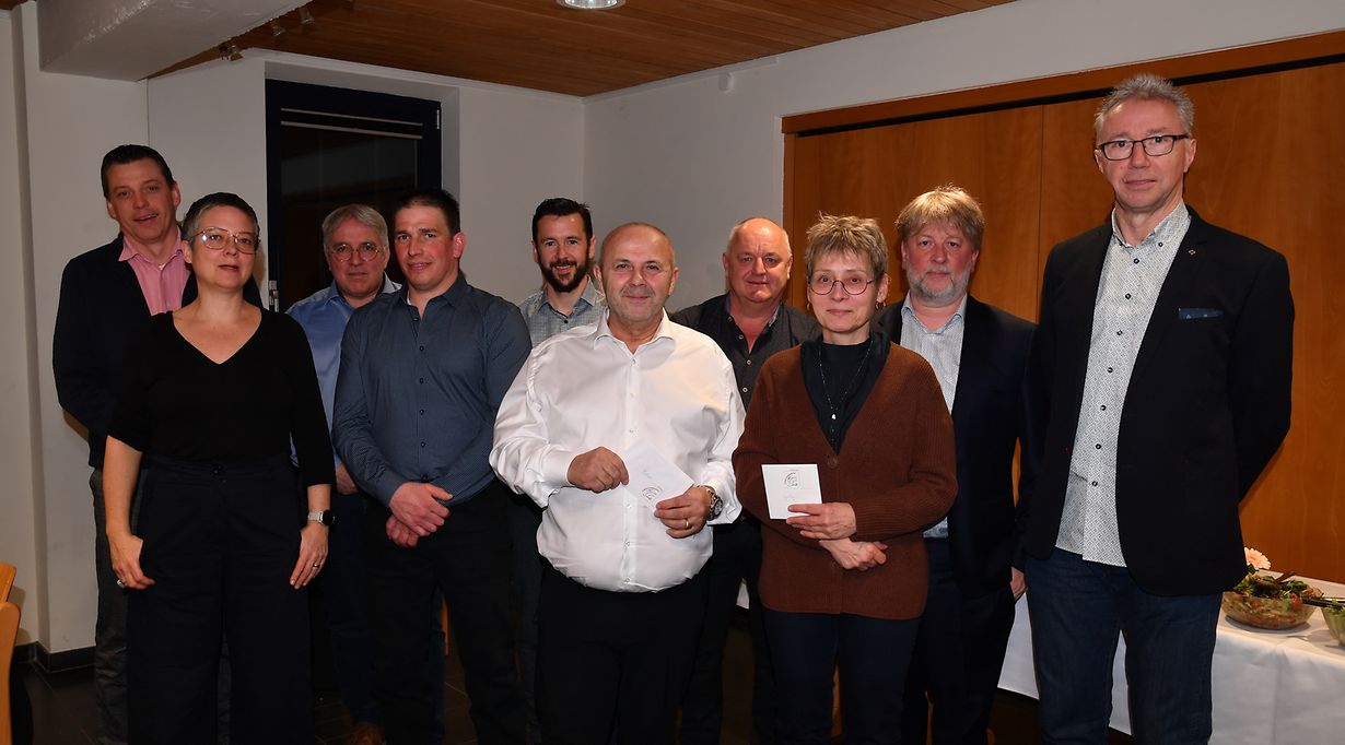 Préizerdaul: Den traditionellen Gemengebanquet ass ëmmer eng gut Geleeënheet fir Bilanz iwert engt erfollegsräichst Joer ze zéihen an all dejenigen Matarbechter Merci ze soen fir hirt Engagement. No sengen Wieder vu Wëllkomm ass de Buergermeeschter Marc Gergen a Presenz vum Schëffen- a Gemengerot op di verschidde Projets agaangen , déi am Laaf vum vergaangene Joer am Beräich vun der Schoul, der Maison Relais, dem Service Technique bis hin zu nei agestalltem Personal, konnten realiséiert gin fir dann och kuurz op di zukünftig Investitiounen hinzeweisen. Doriwer hinaus huet de Buergermeeschter d‘Vertrieder vun de Commissiounen, di Benevol Matarbechter, déi iwert d‘Joer ganz gut Arbecht op fräiwëlleger Basis fir d’Gemeng leeschten och ganz besonnesch erviergestrach. No senge Wierder vu Merci, un all Matarbechter déi am Dingst vum Bierger stongen, koum et zur Personaléierung vun dene Leit, sieff et wëll si een neien Challenge am Liewen sichen oder wëll si an hir woul verdingte Pensioun gin an duefir och mat dem gewënschten Kado honoréiert konnte gin. Beim Personal vun der Maison Relais war et um Kristin Hendrickx , wat vun 2014 bis 2022 bei der Gemeng agestallt war an et faerdeg bruecht huet de Wee vun der „école de la 2ième chance“ fir d’éischt säin Diplom als éducateur diplomé ze machen an duerno och säin Bachelor mat Erfolleg ofzeschléissen. Als zweeten gouf di gut Arbecht vum Yann Kirchen, den och als „éducateur diplomé“ am Zäitraum vun 2014 bis 2022 an der Maison Relais aktiv war, fir seng gut Arbecht och villmols Merci gesoot. De Yann huet sich en neien Challenge ginn um Stausee. Grad esou wi d’Kristin Hendrickx konnt de Yann Kirchen och leider nit den Owend present sin, esou dat di Zwee hire Kado nodréiglich iwereecht kréien. Desweideren huet de Buergermeeschter d’Verdingster vum Gaby Plier- Schumacher, dat vun 2013 bis 2022 als grouss Hëllef vum Patrick Antony an der Maison Relais ëmmer zur Säit stong, ganz besonnesch ervier gehuewen an him eng angenehm Pensioun gewënscht. Op der Gemeng selwer ass dann de Fatmir Blakcori an d’Pensioun gaang, den vun 2016 bis 2022 als „homme fait tout“ eng ganz gut Arbecht geleescht huet. Zu gudder Läscht, ass dem Elsa Nogueira och Merci gesoot gin, dat vun 2007 bis 2020 als ganz engagéiert Botzfra ëmmer fir eng perfekt Schoulbotz gesuergt huet. Hinnen Alleguerten e ganz grousse Merci fir hirt Schaffen an all dene Joeren am Dingst vun der Gemeng Préizerdaul. De angenehmen Owend ass bei engem deftige Menü a gudder Gesellschaft a bei flotter Danzmusik mam Mike Poiré op en Ënn gaangen. (CR) Foto: Charel Reiser)