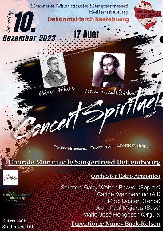 Zesumme mat de Solisten Gaby Wolter-Boever, Carine Weicherding, Marc Dostert a Jean-Paul Majerus, op der Uergel Marie-José Hengesch an dem Orchester Estro Armonico séngt d'Chorale Municipale Sängerfreed den 10. Dezember 2023 um 17.00 Auer zu Beetebuerg an der Dekanatskierch ënner der Direktioun vum Nancy Back-Kelsen.