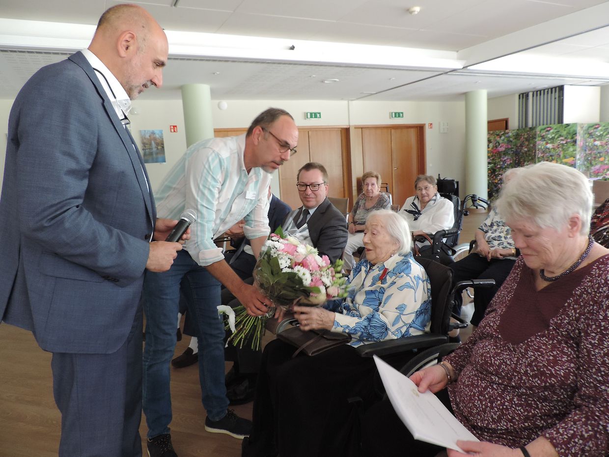 Bei enger Kippche Cremant an e puer Häppercher huet d'Direktioun vum Haus der Jubilarin ee grousse Bouquet iwwerreecht. De ville Felicitatiounen hu sech ugeschloss, d'Presidentin vum Heemrot, d'Madamm Mohren mat engem léiwe perséinleche Fotos-Cado grad ewéi d'Amciale mat engem flotte Blummenarrangement, deen d'Presidentin Madamm Salvestrin iwwerreecht huet.