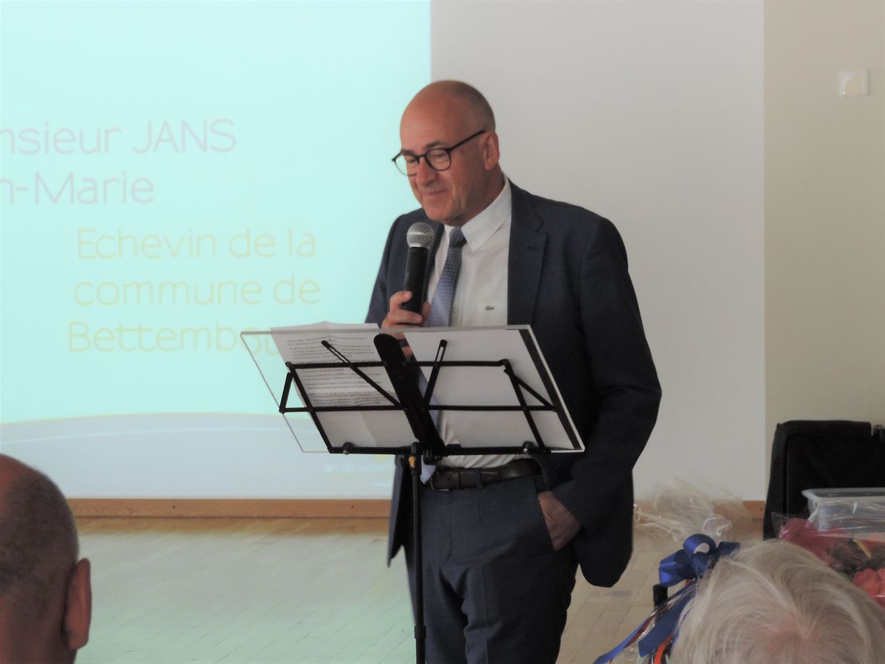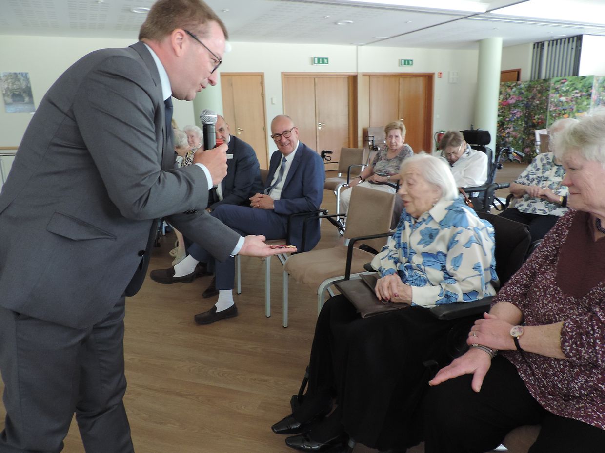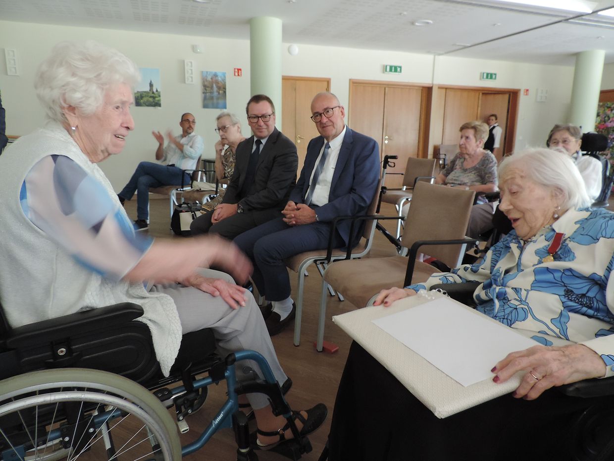 De Beetebuerger Schëffen Jean-Marie Jans an de Minister Marc Hansen ware mat um Rendez-Vous. Der Jubilarin gouf säitens vum Herr Minister d’Médaille am Ordre de Mérite (Médaille en Vermeil) ugespéngelt.