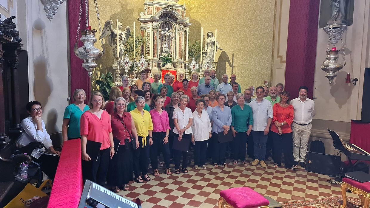 Flaibano. Viele Familien und deren Nachkommen, die heute in Luxemburg leben, entstammen dieser norditalienischen Ortschaft. Ein-, höchstens zweistöckige Häuser stehen um die Kirche, verteilen sich mit ihren reichbepflanzten Gärten entlang der Straßen und Plätze. Flaibano zählt an die 1.100 Einwohner und grenzt u. a. an die Gemeinde Spilimbergo. Bevor die Figur der lokalen Heiligen Philomena in einem gläsernen Schrein auf den Schultern der Männer durch die Straßen getragen wurde, gestaltete der Chor die Sonntagsmesse. Auf dem Programm standen u.a. Werke von Jerry Estes und W.A.Mozart, sein Alleluia aus Exsultate jubilate und das Ave Verum. Unter der Leitung von Nancy Back-Kelsen und mit an der Orgel Romain Ludwig wussten die SängerInnen in der voll besetzten Chiesa parrocchiale della Beata Vergine Annunziata zu überzeugen. Das Schlusslied O Mamm léif Mamm wurde mit kräftigem Applaus bedacht.