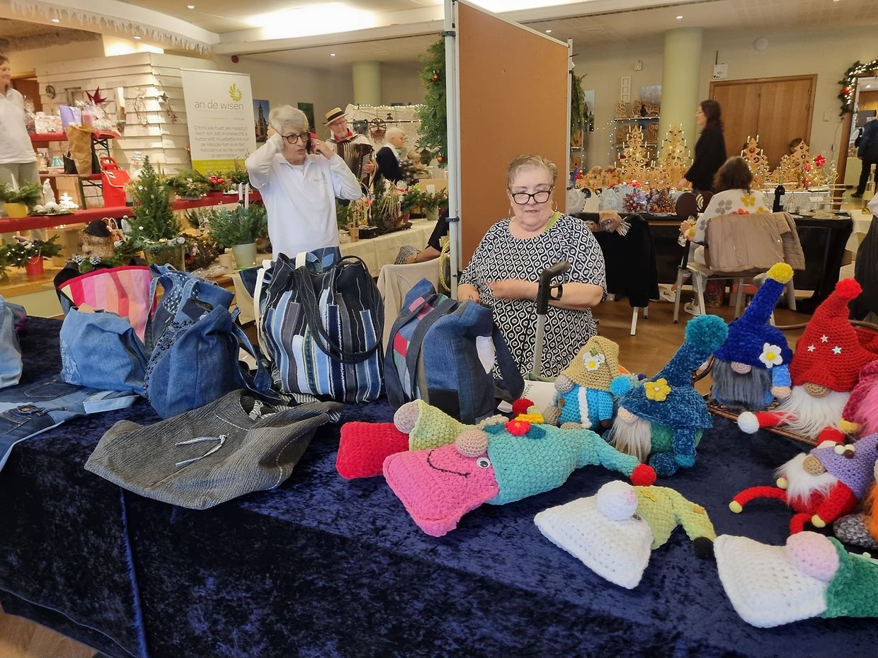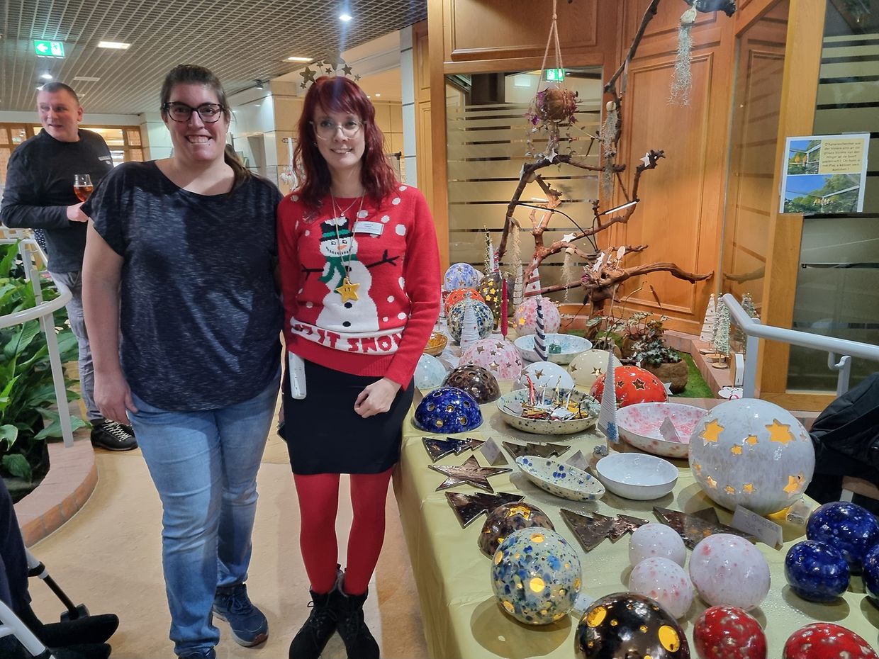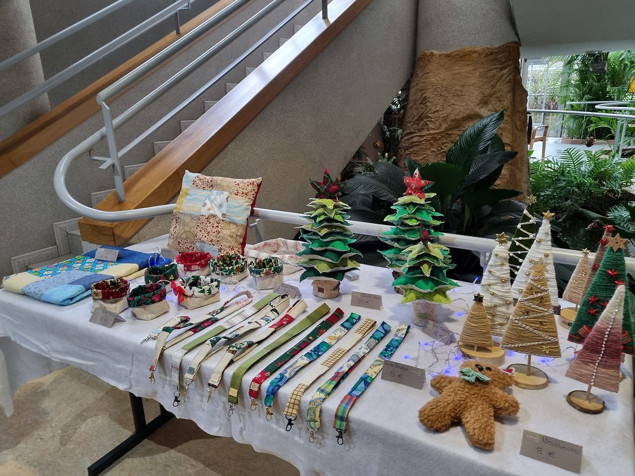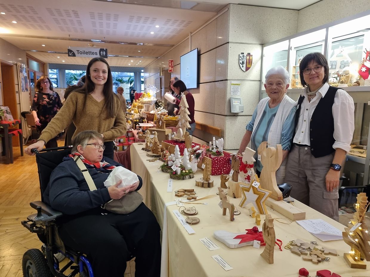 Divers stands d’articles et produits artisanaux de Noël, tenus par des associations ou par les résidents eux-mêmes, qui proposaient leurs créations réalisées lors des activités de la résidence (articles en bois par Medana, poterie, atelier couture, «Konschtatelier", etc.)