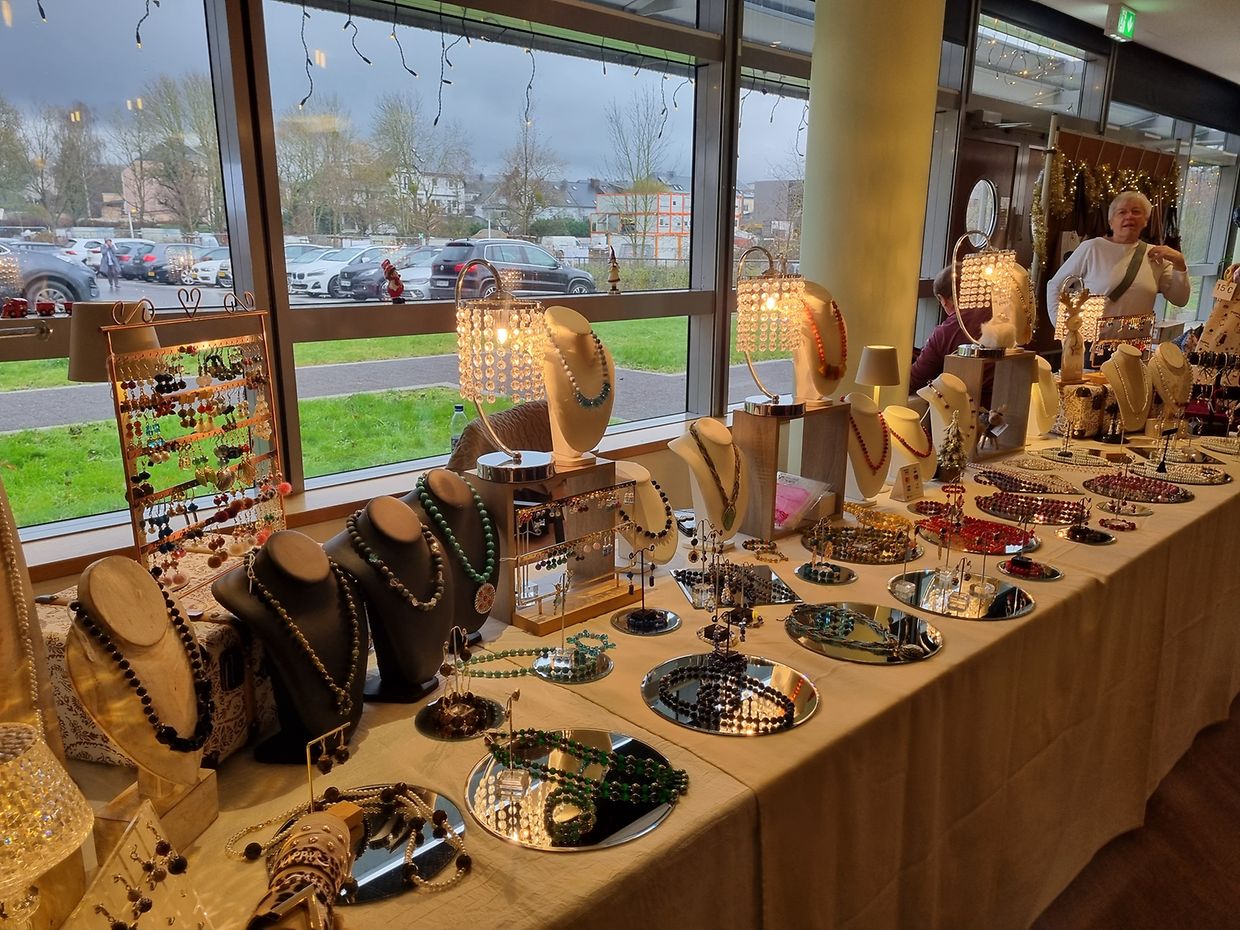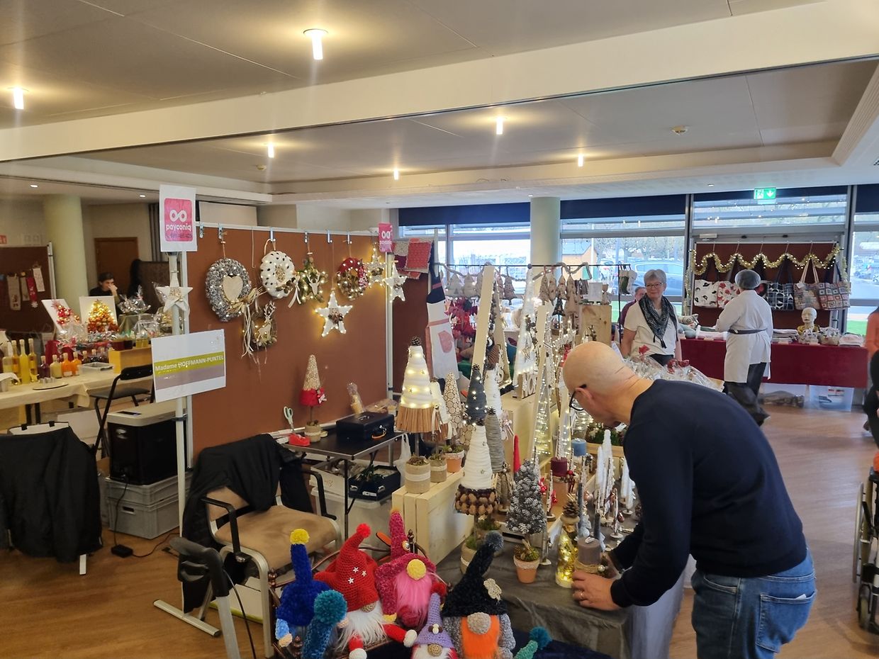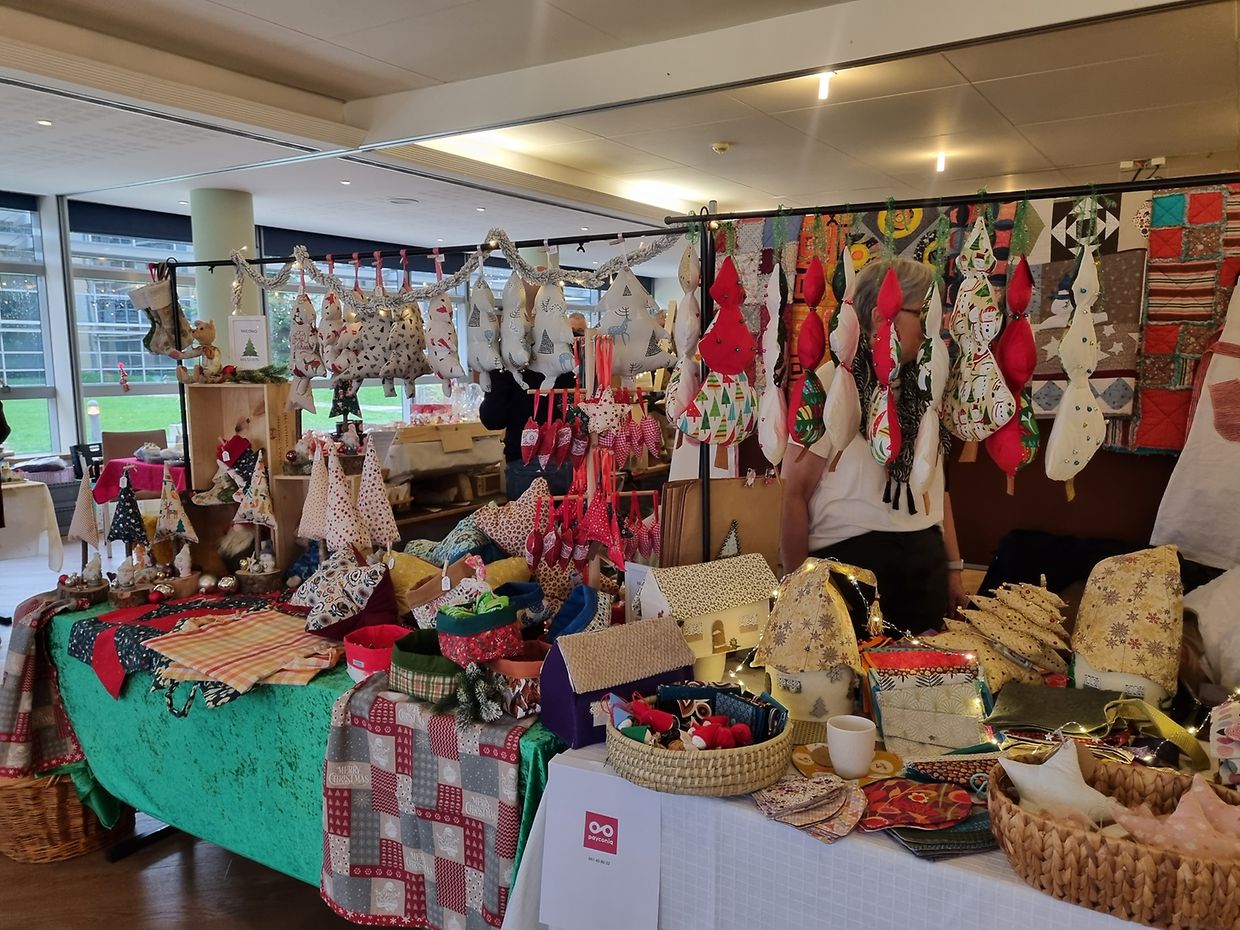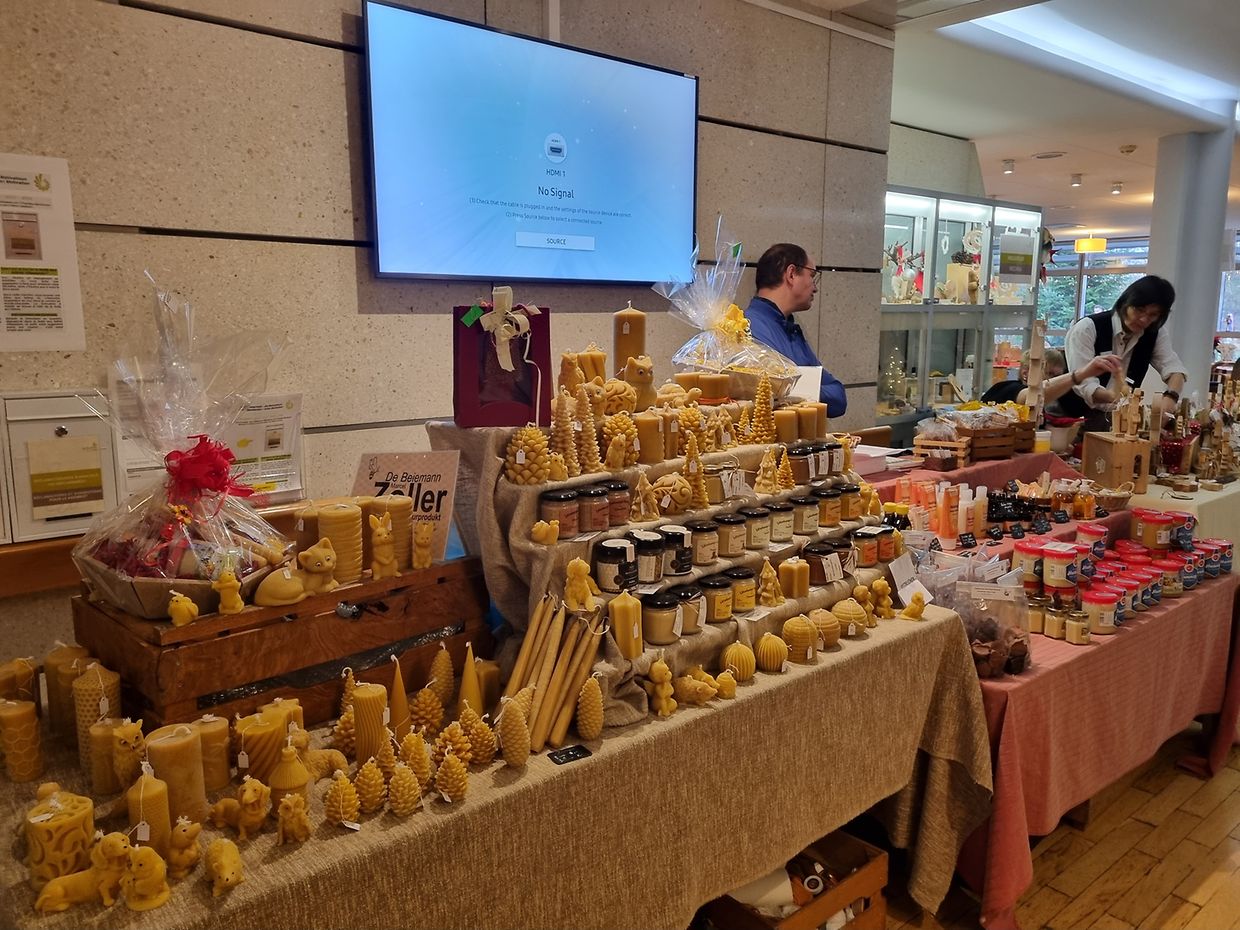 Divers stands d’articles et produits artisanaux de Noël, tenus par des associations ou par les résidents eux-mêmes, qui proposaient leurs créations réalisées lors des activités de la résidence (articles en bois par Medana, poterie, atelier couture, «Konschtatelier", etc.)