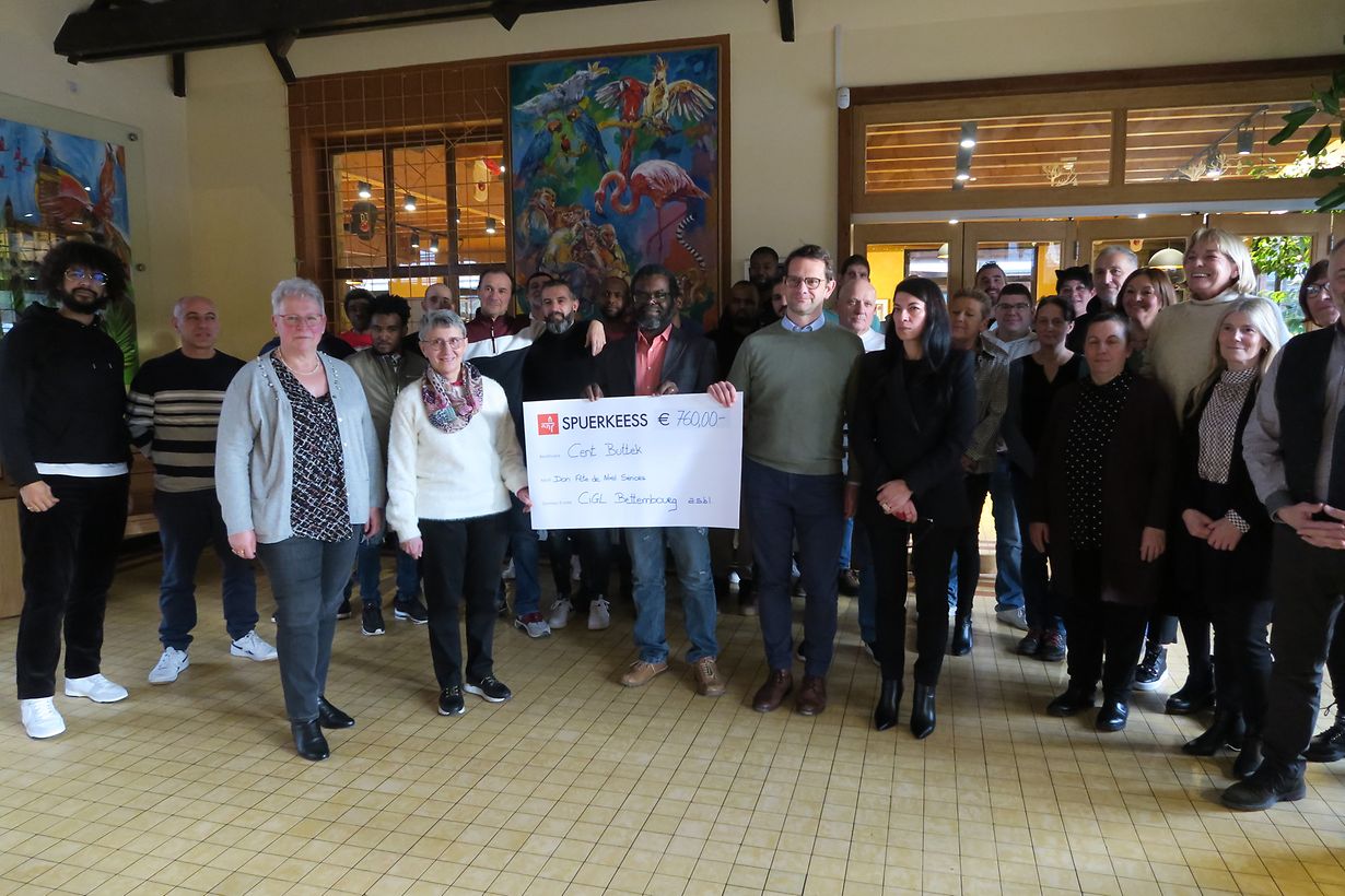 Anlässlich der traditionnelen Weihnachtsfeier für die Mitarbeiter überreichten der Verwaltungsrat und die Direktion des CIGL Bettembourg einen Scheck über 760 Euro an die Verantwortlichen des lokalen Cent Buttek. Dabei handelt es sich um den Erlös der von Mitarbeitern der lokalen Beschäftigungsinitiative angefertigten Holzgegenstände, welche auf dem lokalen Weihnachtsmarkt im Dezember verkauft wurden.