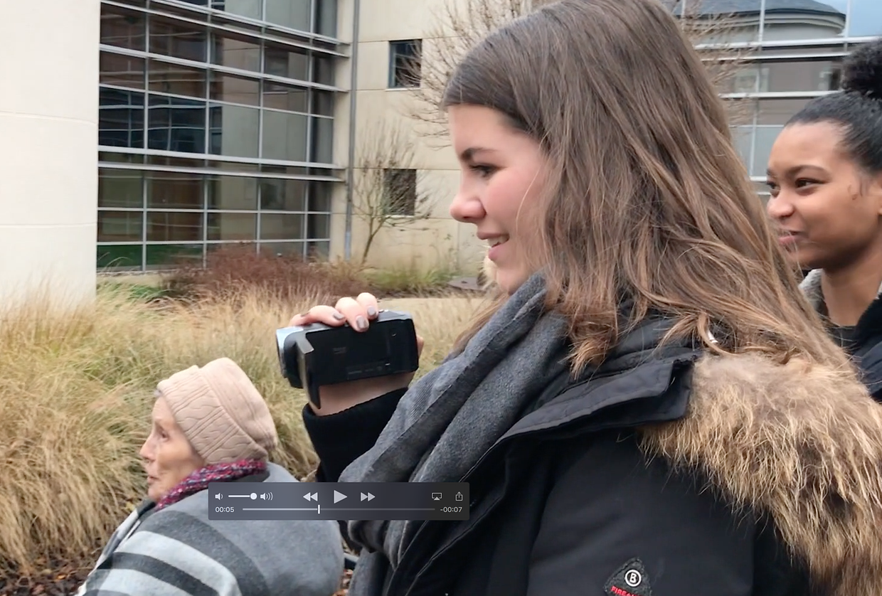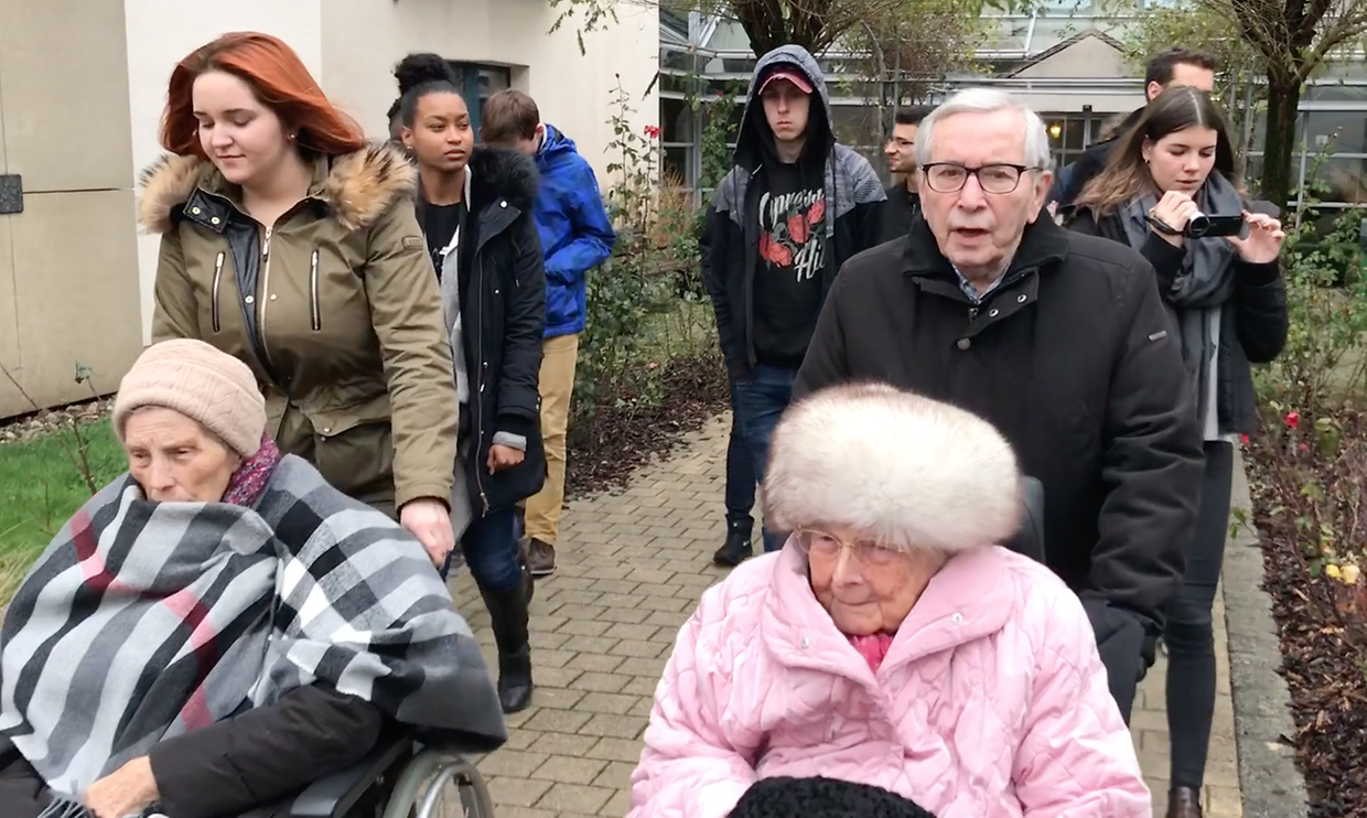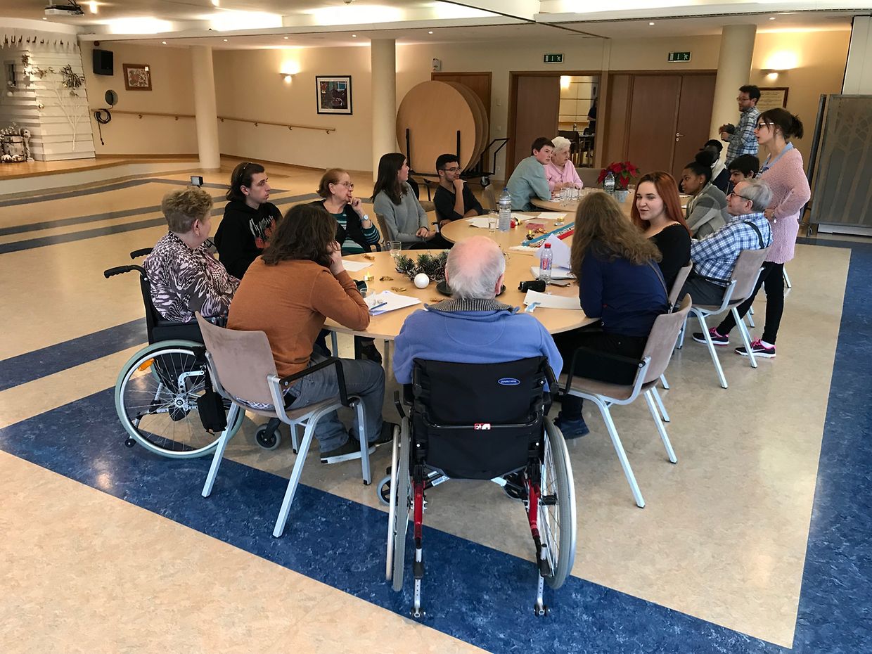 „Résidence pour personnes âgées an de Wisen“. Do hu si sech de ganzen Dag iwwer mat ausgewielten Heimbewunner iwwert „eist Land, seng Awunner a seng Macken“ ënnerhalen - e Sujet, deen esou vun den Organisateur’en vum Concours „Jeune Journaliste 2018“ lancéiert gouf.