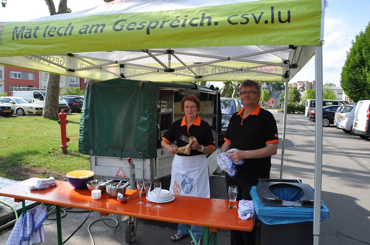 So auch dieses Jahr als die CSVler am 22. Mai wiederum ihre Zelte auf dem Kirchplatz aufschlugen. Neben dem obligaten "Wippchen", einem kühlen "Béierchen" kamen die Besucher vor allem für die legendären "Eisekuchen" des ehemaligen Bäkermeister Zeimet.
