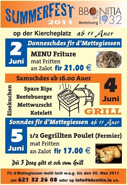 Dem BBC Nitia Beetebuerg säin traditionellt Summerfest gëtt dëst Joer iwwer dräi Deeg organiséiert. A wéi ëmmer gëtt et och dëst Joer erëm t'Méiglechkeet fir e ganze Menü ze degustéieren.