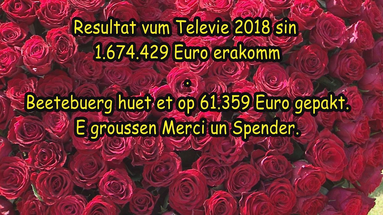 Hei e puer flott Impressiounen vum Televie, e Samsdeg den 21. Abrëll 2018. Leider sin dat hei nemme Momentopnahmen, well de ganzen Dag ass esou vill lass gewierscht, dat en net alles filmen konnt. Resultat vum Televie 2018 sin 1.674.429 Euro erakomm. Beetebuerg huet et op 61.359 Euro gepakt. E groussen Merci un Spender. De Videoreportage wéi gewinnt op menger Facebooksäit: Beetebuerger Cronicle: https://www.facebook.com/groups/1632643696801978/