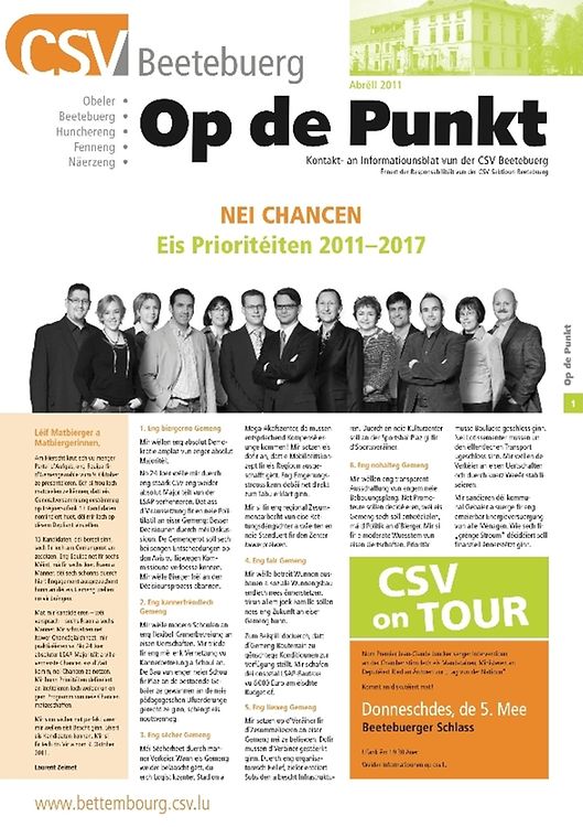 Die Kandidaten der CSV für die Gemeinderatswahl am 9. Oktober stellen sich im neuen "OP DE PUNKT" vor, der in diesen Tagen in den Ortschaften Bettemburg, Abweiler, Hüncheringen, Nörtzingen und Fenningen an alle Haushalte verteilt wird.